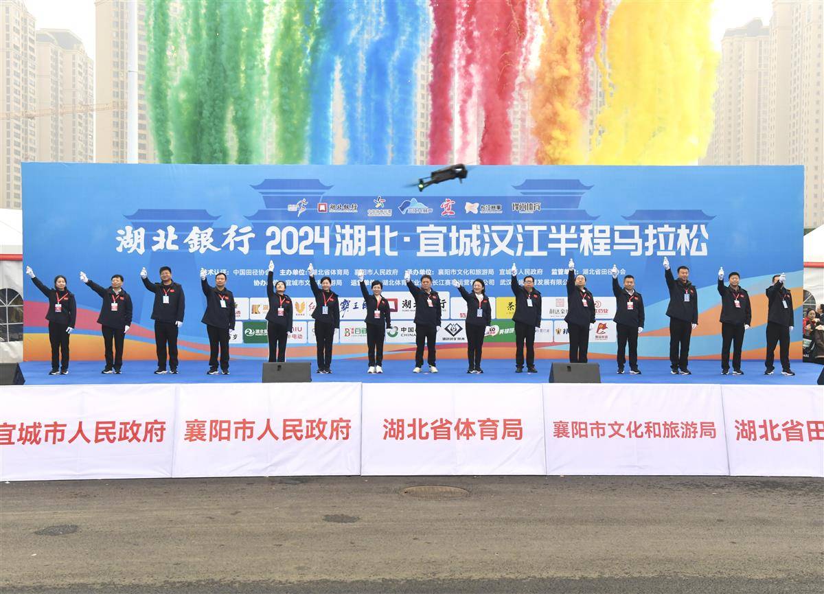 24日6时,湖北银行2024湖北·宜城汉江半程马拉松起点处——楚都文化中心人头攒动,参赛选手在此进行赛前热身。