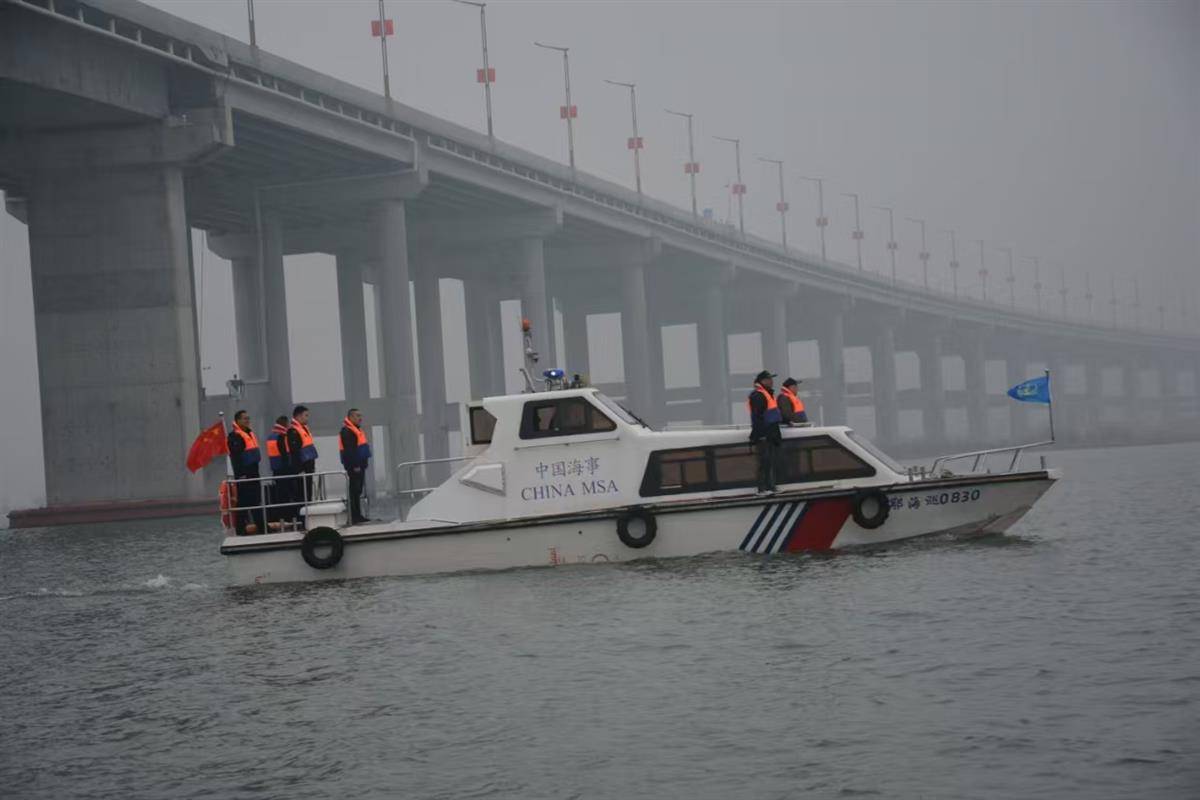 同一时间,宜城市应急管理局、海事处水上应急救援工作专班人员已乘坐海事巡逻艇来到倚天大桥下的汉江水域,巡逻艇在江面的晨雾中泊驻,艇内放置着一叠叠救生衣,为突发事件应急救援做好万全准备。