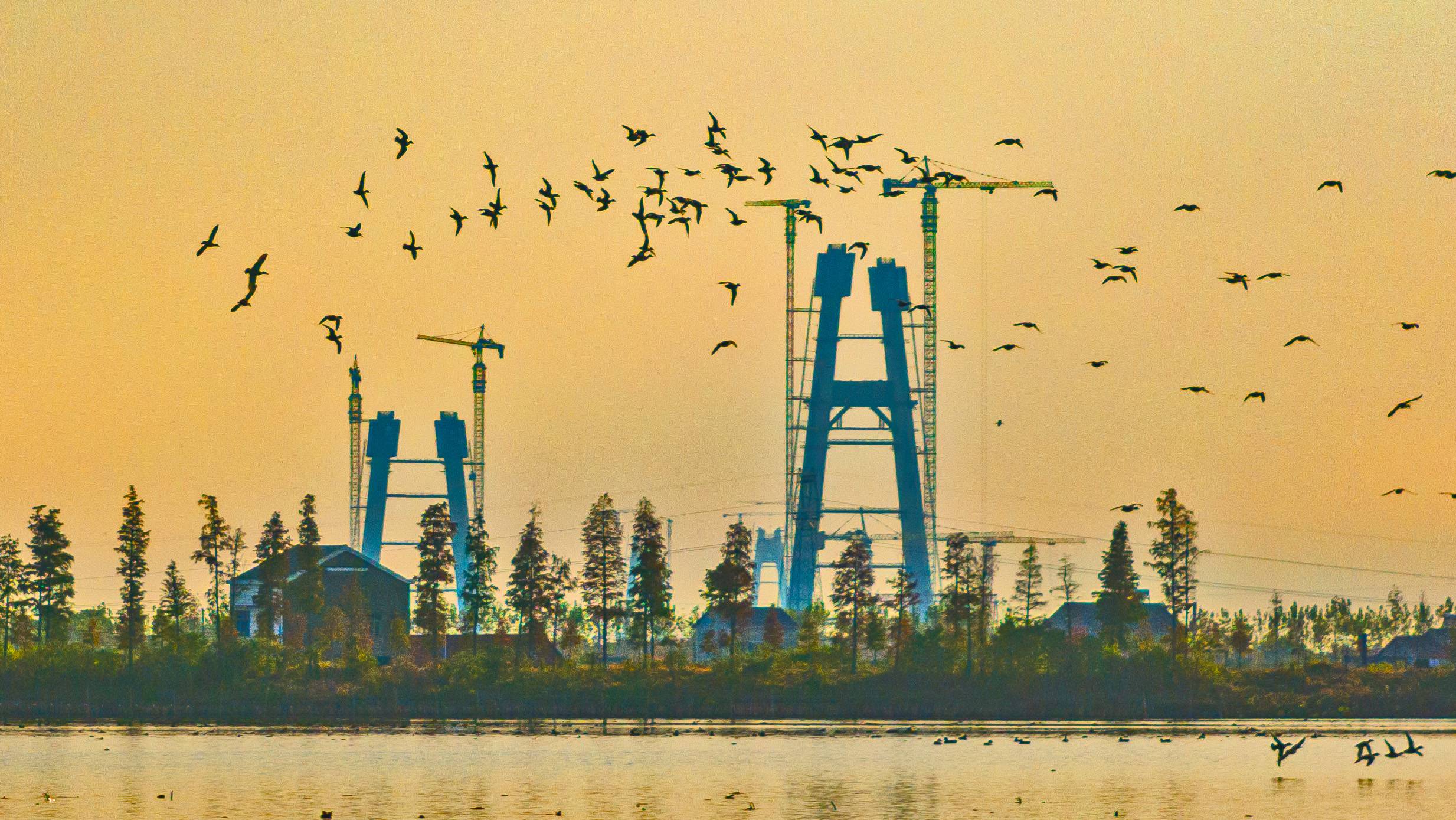 11月25日,初冬的暖阳下,湖北枝江长江大桥主塔部分正在拔节长高,目前主塔已经完成187.5米,预计建成总高度是241米,完成度为78%。来长江宜昌段越冬的候鸟在大桥工地旁边的水面上空盘旋嬉戏。据了解,枝江长江大桥主跨890米,全长1549米,设计标准为双向六车道,设计速度每小时120公里,预计2026年建成通车。届时,将串联当阳、枝江、松滋三地,对助力百强县市聚集区互联互通、推动宜荆荆都市圈一体化发展具有重要作用。(湖北日报全媒记者 刘曙松 通讯员 毛晓娜 摄)