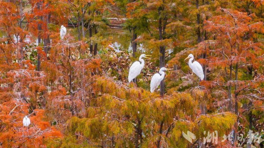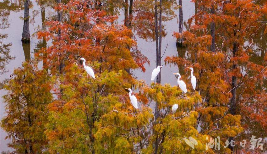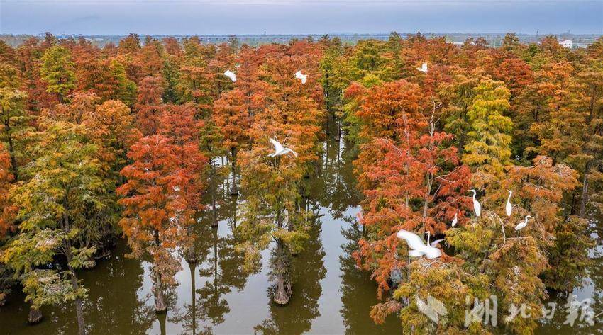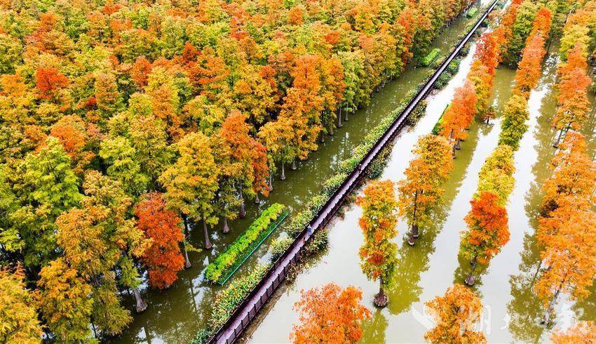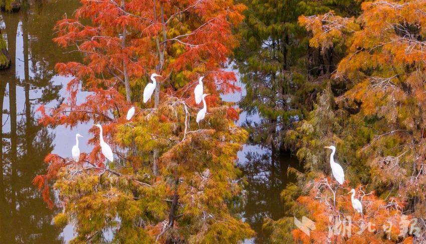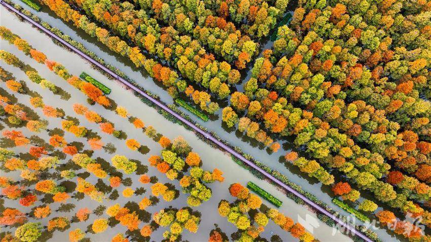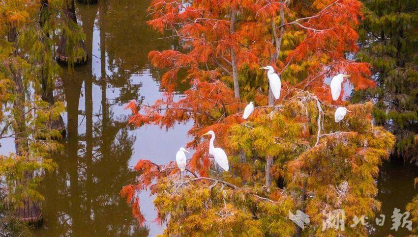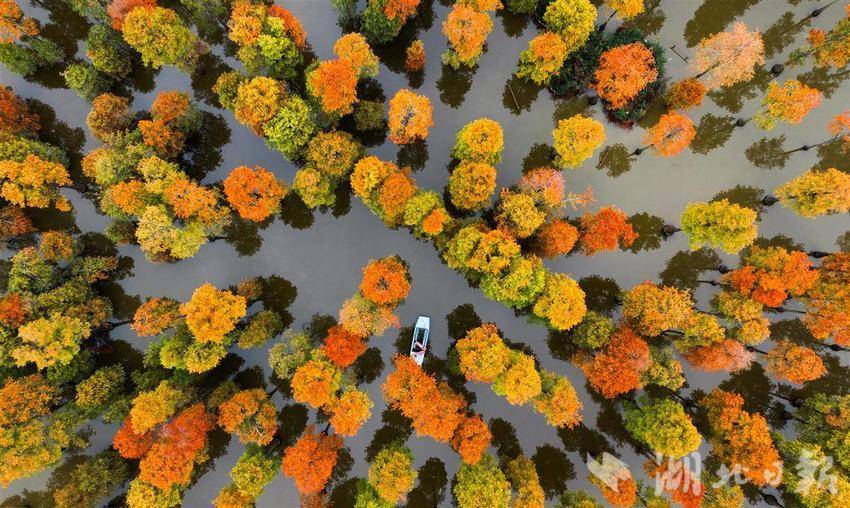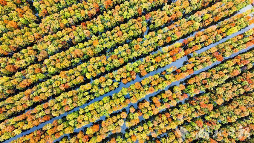 11月26日,武汉涨渡湖湿地公园,万余棵池杉静立,红黄相间的树叶倒映在水中,构成一幅多彩油画。
