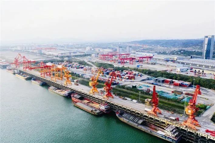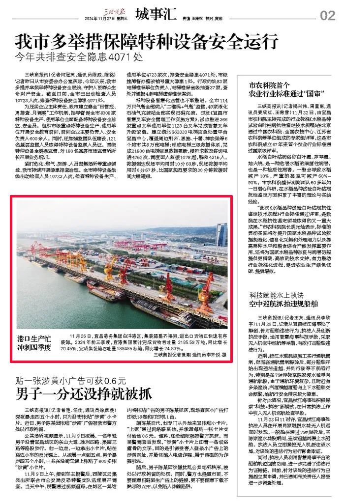 11月26日,宜昌港务集团白洋港区,集装箱整齐排列,进出口货物正快速有序装卸。2024年前三季度,宜港集团累计完成货物吞吐量 2185.59万吨,同比增长 20.45%;完成集装箱吞吐量188485标箱,同比增长 24.83%。(三峡商报记者黄翔 通讯员李齐悦 摄)