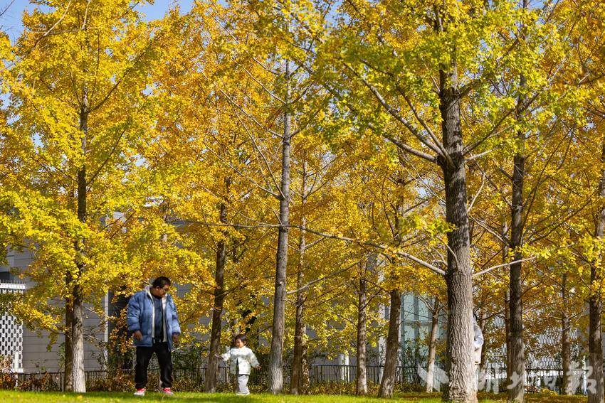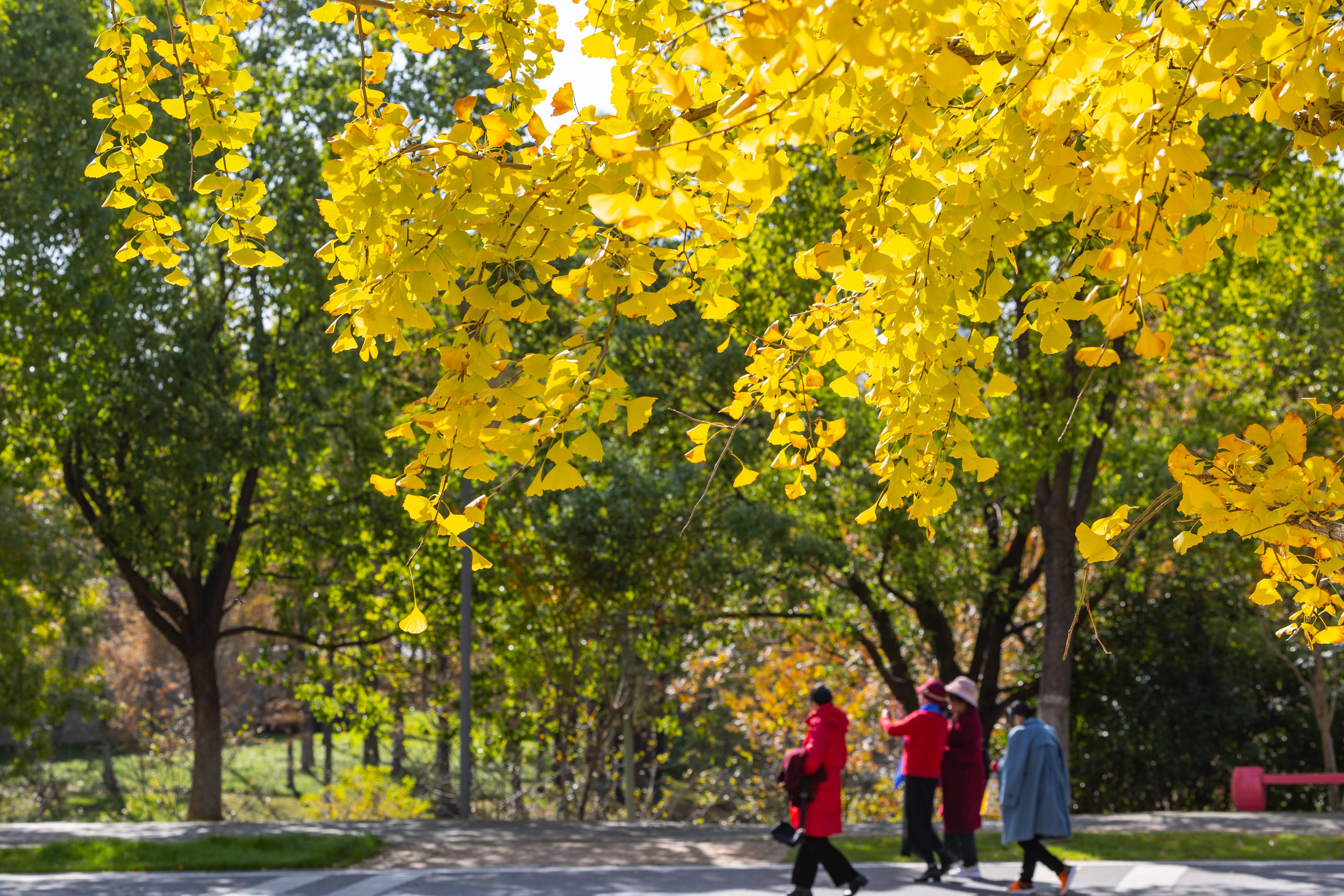 在阳光的照射下,金灿灿的银杏叶连成一片,吸引了不少市民游客驻足观赏。(湖北日报全媒记者 倪娜 通讯员 徐志刚 摄)