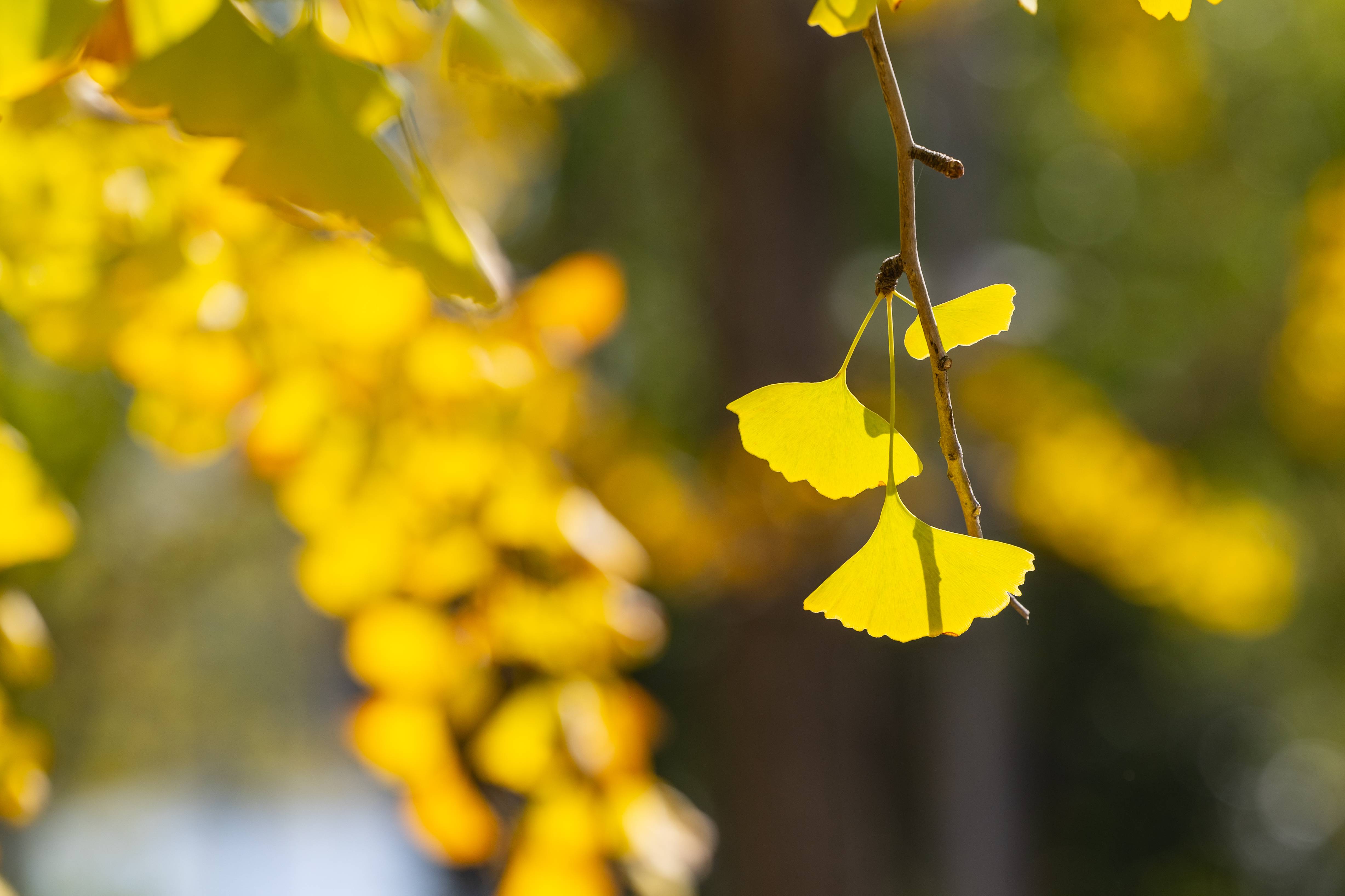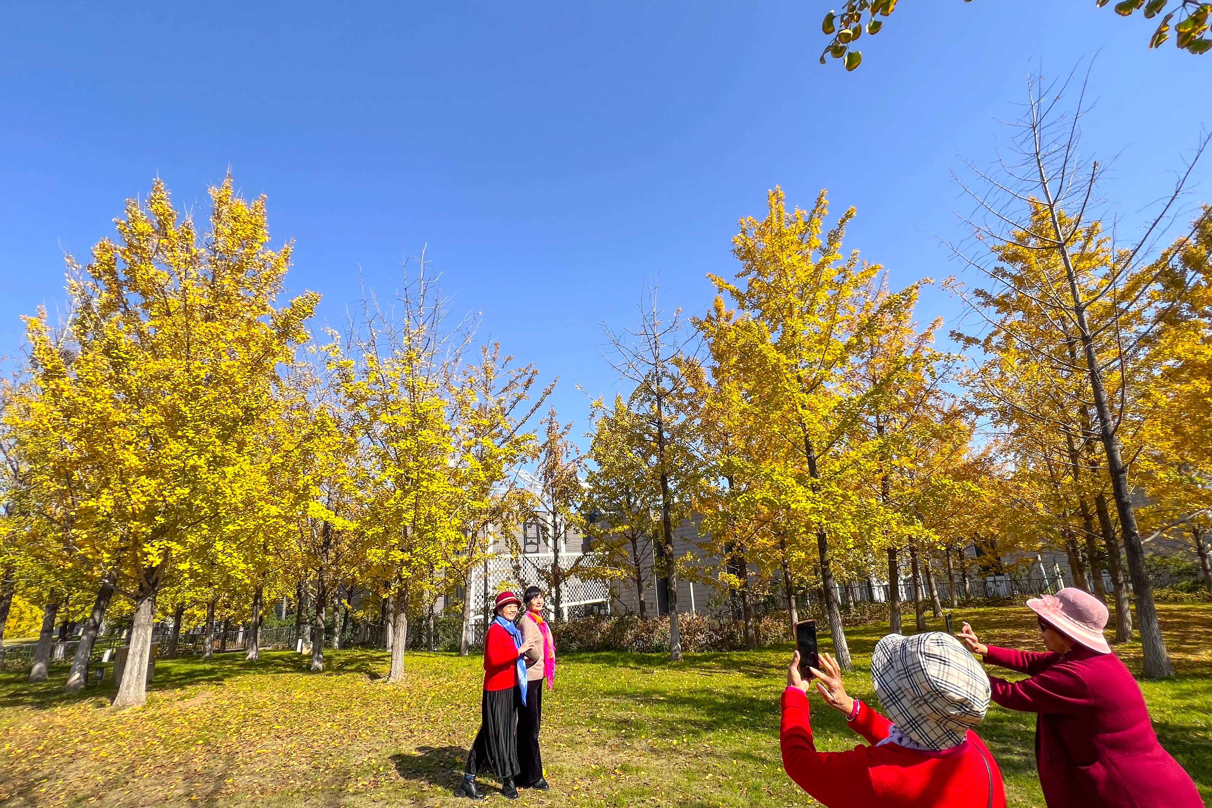 11月27日,市民在银杏树下拍照打卡。阳光普照,气温回升,武汉园博园长江文明馆周边数百棵银杏树已经变成了金黄色,迎来最佳观赏期。