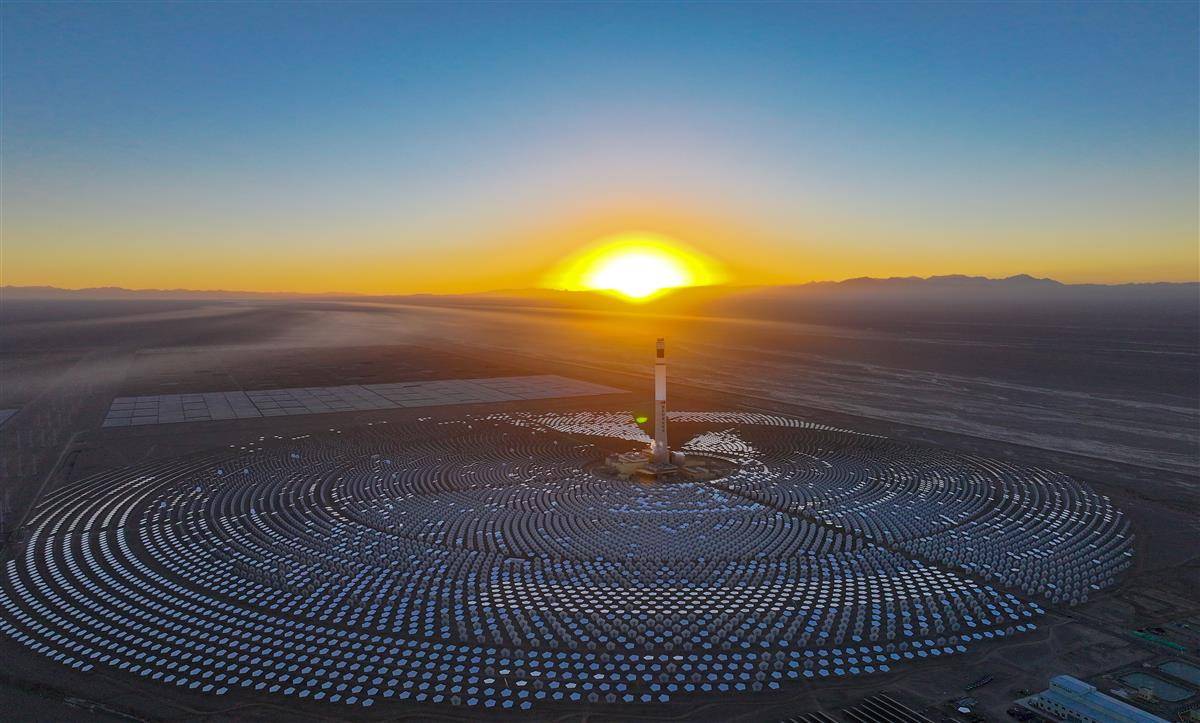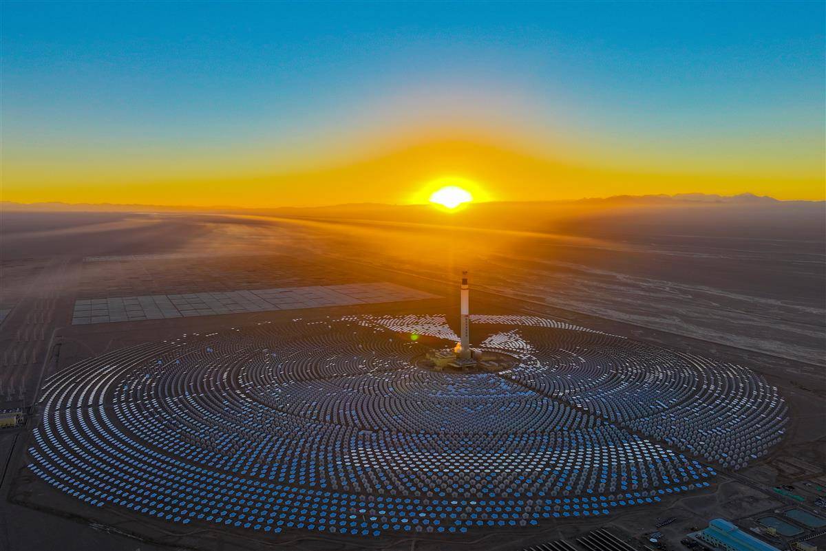 此次并网发电的光热区占地面积约3.2平方公里,采用塔式聚光发电技术,以熔盐作为热储能介质。该区域的核心建筑是吸热塔,是整个光热电站的聚光中心,在其周围,同心圆式排布的11960面定日镜通过反射将太阳光汇集到塔顶的吸热器表面,收集热量形成高温,经过熔盐-水换热系统,产生过热蒸汽,驱动汽轮机发电。