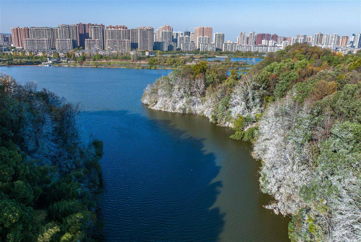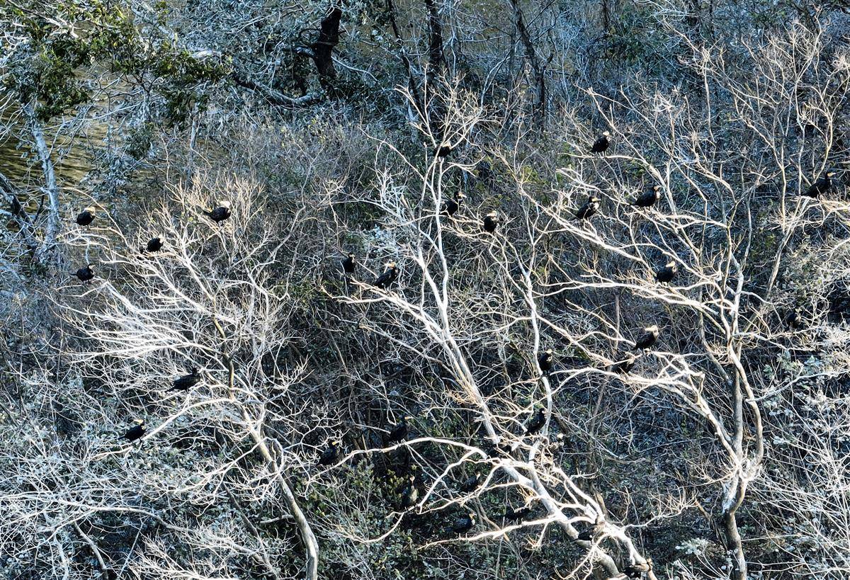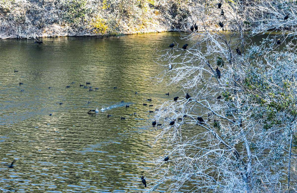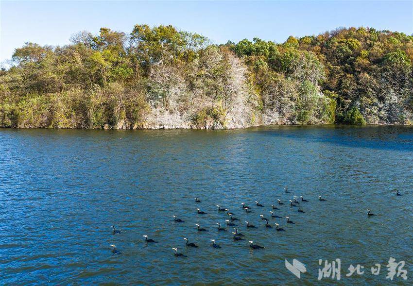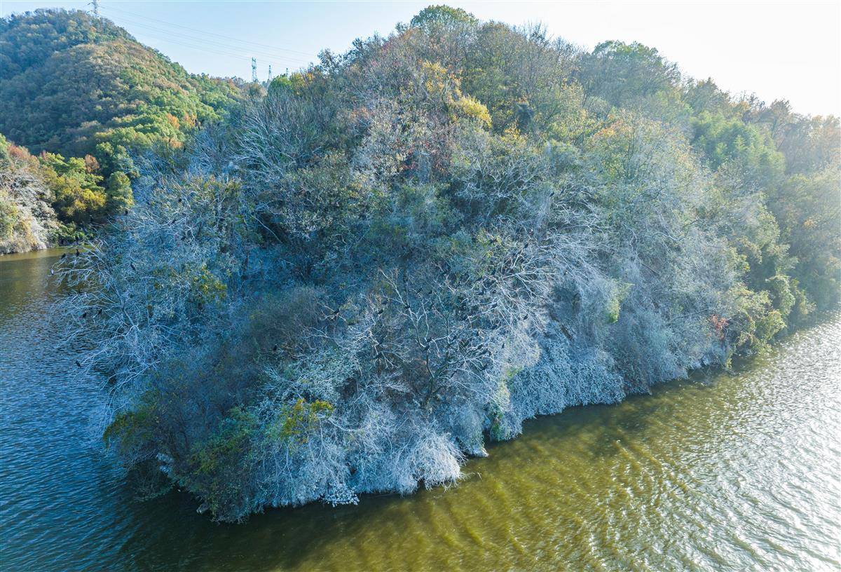 11月28日,黄石青港湖大众山,野生鸬鹚演绎的“残雪”美景。每年冬天至次年清明前夕,这里便会出现一大片似雪非雪的白色灌木丛,在此栖息的候鸟鸬鹚留下的羽毛和粪便,染白了崖壁灌木丛,形成了琼枝玉树般的“雪景”。(湖北日报全媒记者 薛婷 通讯员 何戈 摄)