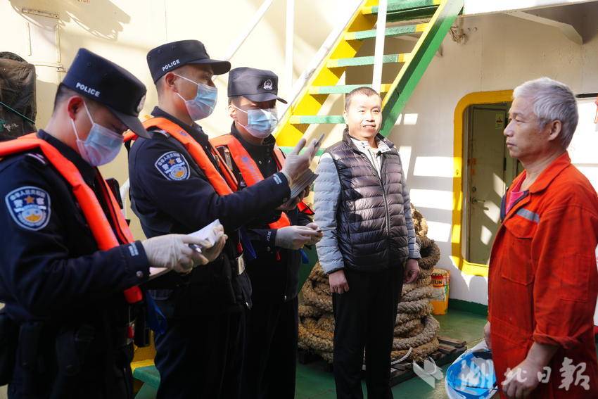 湖北边检民警为靠泊在岸的“新翊远1轮”船员办理入境边防检查手续。