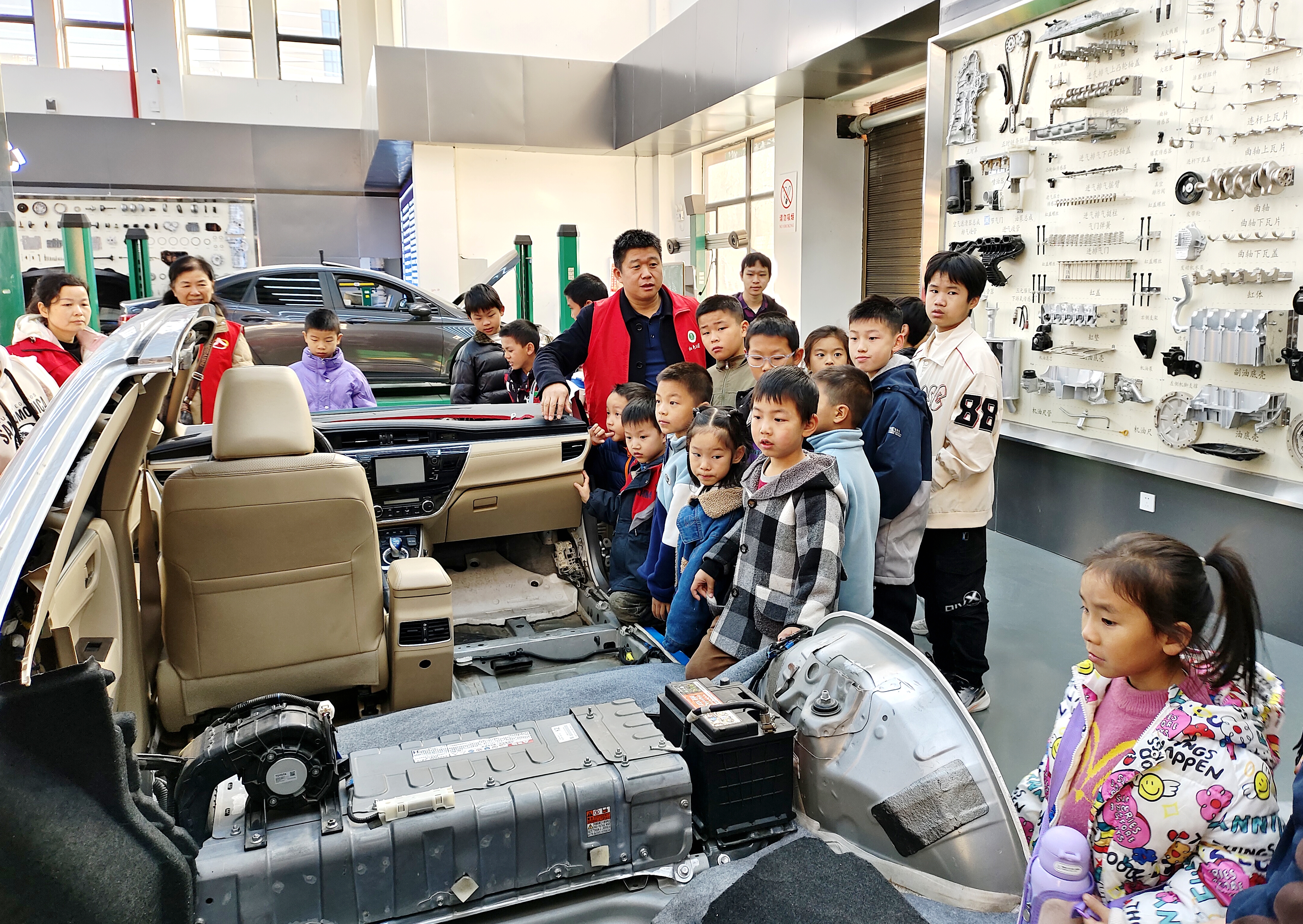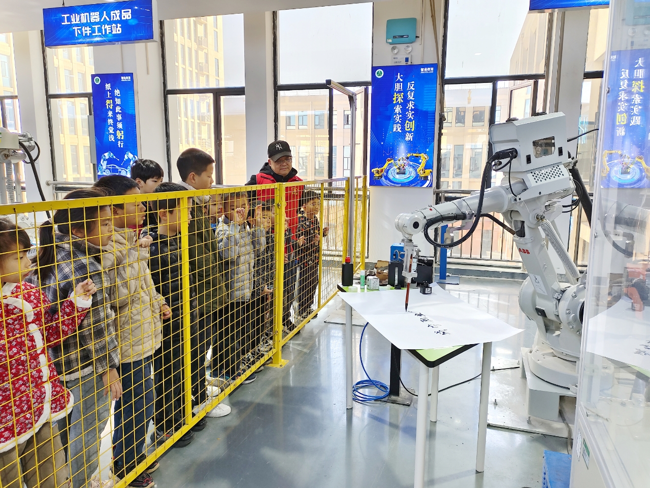 观影结束后,孩子们前往汽车实训中心,观摩各种先进的汽车实训设备和模拟系统,了解汽车的基本构造和工作原理。在智能制造实训大楼的工业机器人中心,孩子们参观形态各异的工业机器人,了解机器人在工业生产中的广泛应用。当看到机器人用机械臂写字时,孩子们发出阵阵惊叹;当机械狗展示各种高难度动作和精彩的舞蹈,更引发孩子们的掌声和欢呼。