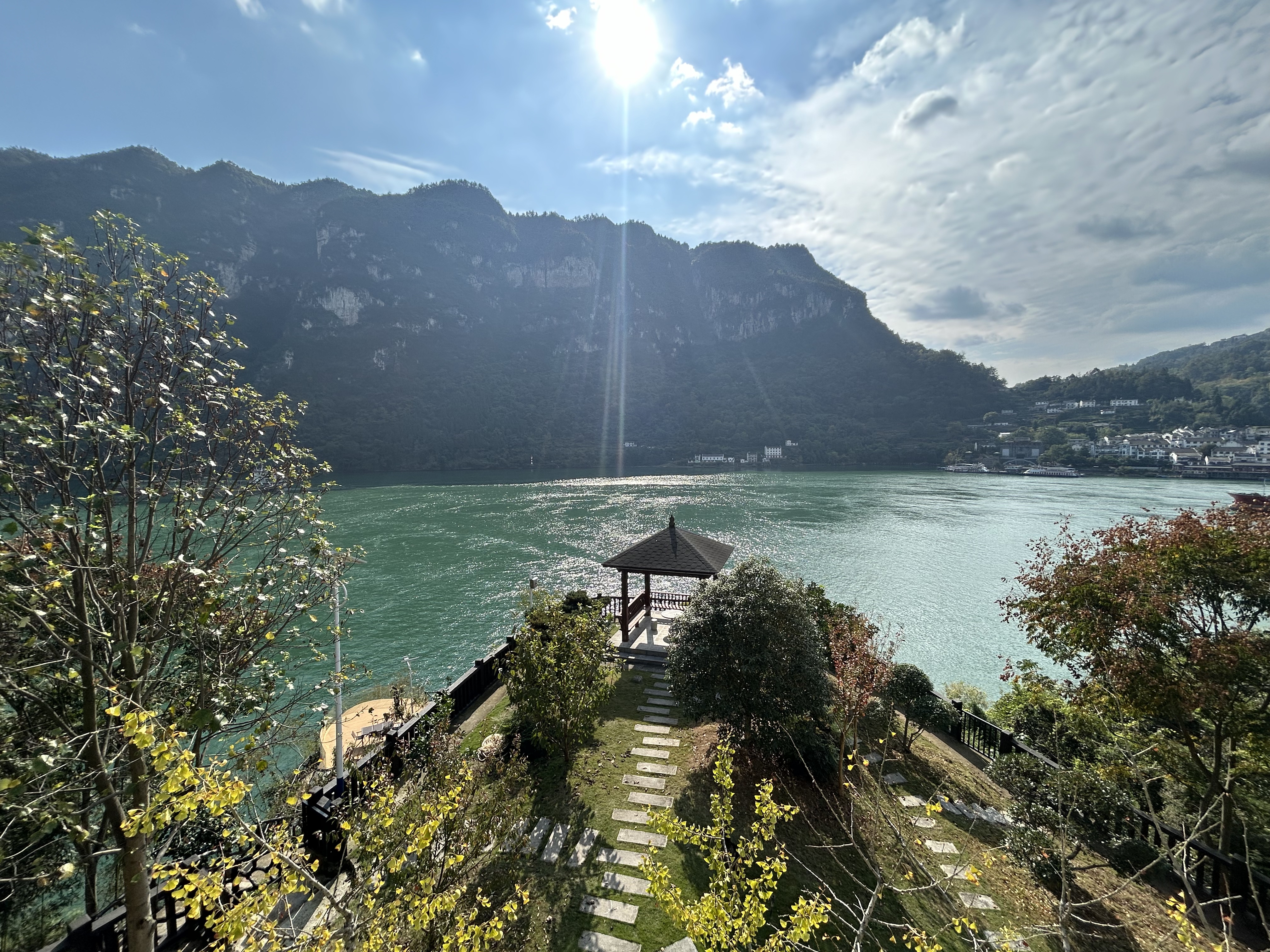 冬天的峡江洒着阳光,粼粼波光闪闪发亮。江畔的苏家别院被江风轻拂,暖意洋洋,游客们被庭院的江景所吸引,步之所及,皆为惬意。