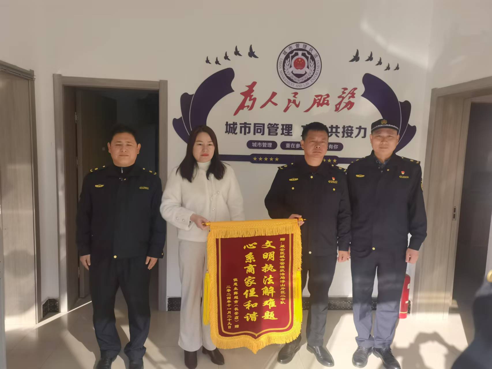 湖北日报客户端讯(通讯员陈波、王清加)“感谢咸安区城管执法局为群众办实事,让周边居民拥有一个良好的生活环境。”12月2日上午,佳惠生鲜超市负责人将一面写有“文明执法解难题 心系商家促和谐”的锦旗送至咸安区城管执法局浮山片区,表达对该局文明执法、为民服务的感激之情。