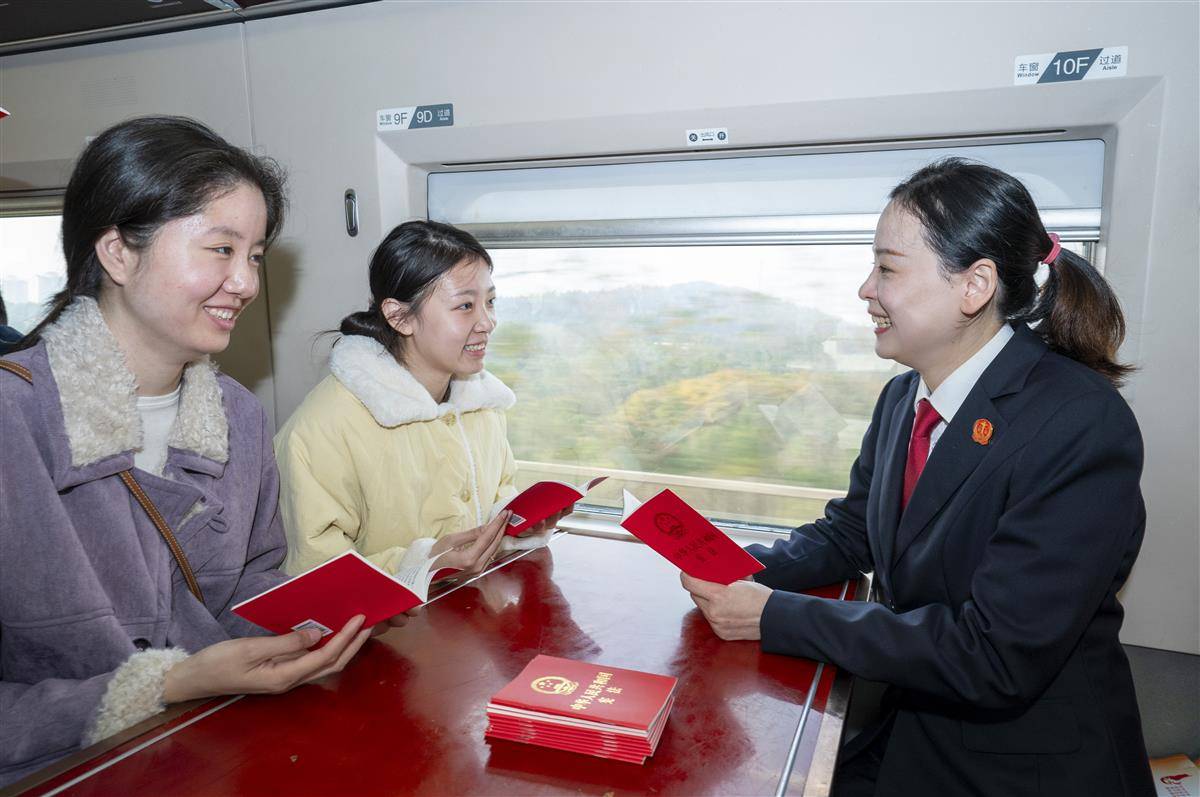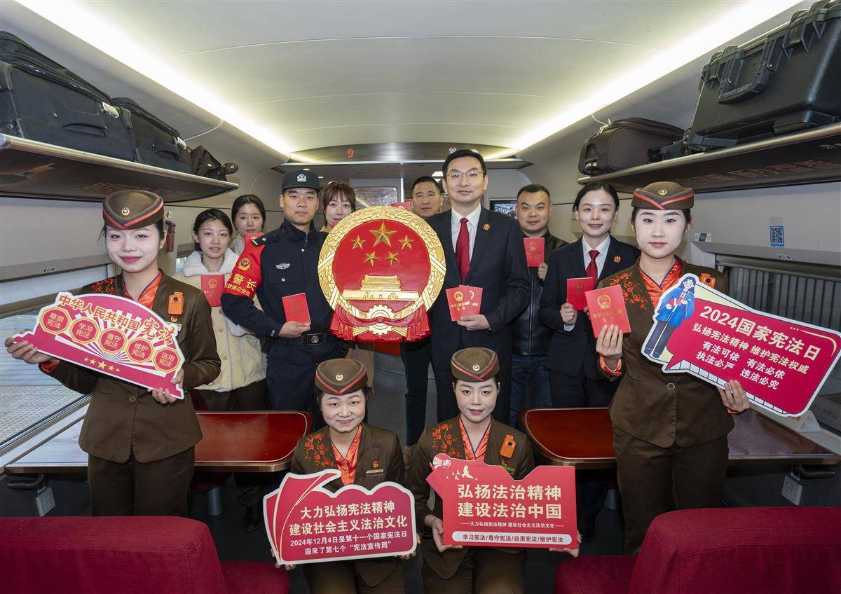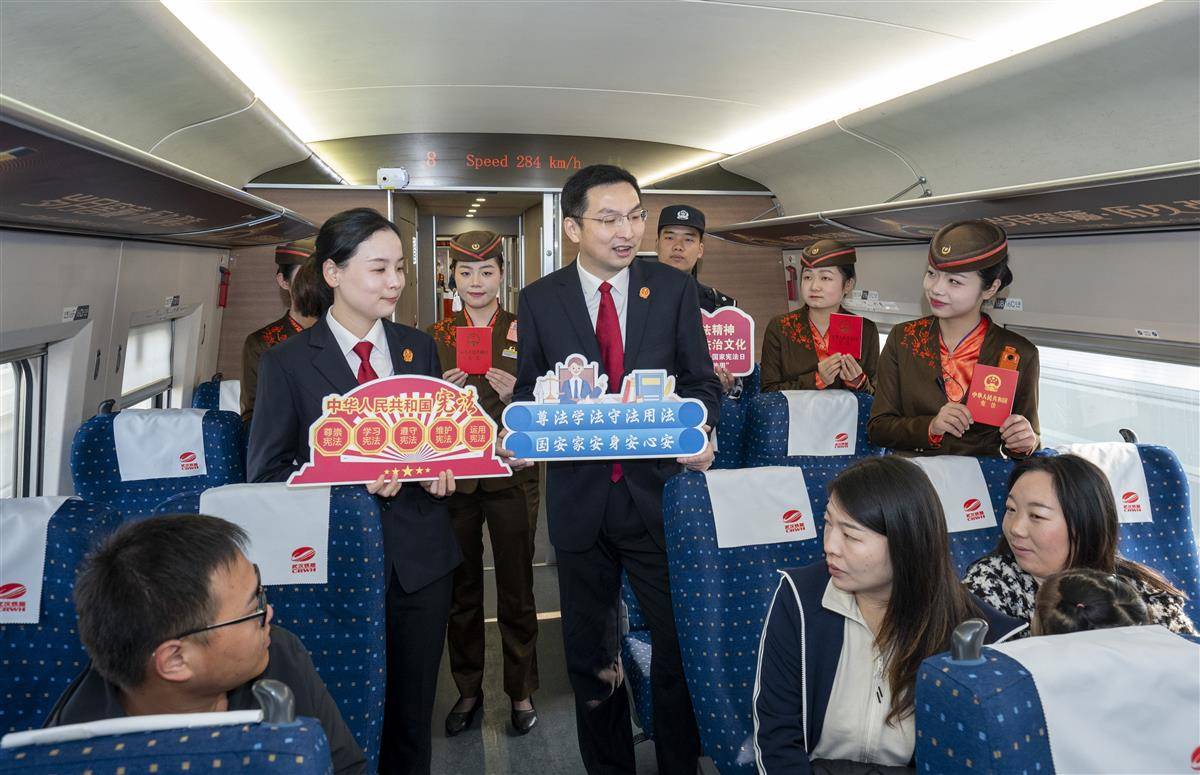 12月3日,第十一个国家宪法日暨第七个宪法宣传周到来之际,武汉铁路运输中级人民法院联合武汉客运段,在G1005次高速列车上开展宪法宣传活动,向广大旅客宣传宪法知识,弘扬宪法精神。