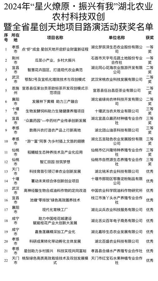 湖北日报讯(记者文俊、通讯员张一博)11月29日,以“星火燎原・振兴有我”为主题的2024年度湖北农业农村科技双创暨全省星创天地项目路演活动成功举办。来自全省10个地市的22家优质农业科技创新创业及星创天地孵化项目从各地遴选推荐的50余个项目中脱颖而出,最终进入项目路演评比。