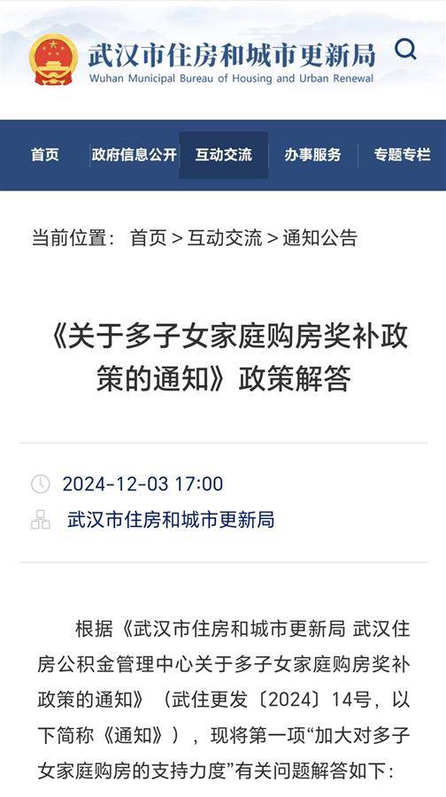 湖北日报讯(记者马文俊)12月1日从武汉市住房和城市更新局获悉,根据《武汉市住房和城市更新局 武汉住房公积金管理中心关于多子女家庭购房奖补政策的通知》(武住更发〔2024〕14号,以下简称《通知》),现将第一项“加大对多子女家庭购房的支持力度”有关问题解答如下: