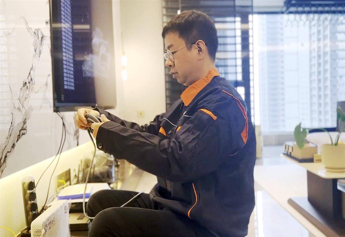 武汉电信工作人员为武昌绿地海珀御观小区居民李先生安装全省首个万兆家用网络。(武汉电信 供图)