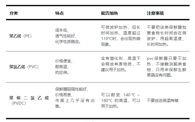 市面上常见的食品级保鲜膜材质主要有聚乙烯(PE)、聚氯乙烯(PVC)、聚偏二氯乙烯(PVDC)和其他生物降解材料。我们总结了材质特点和使用注意事项↓