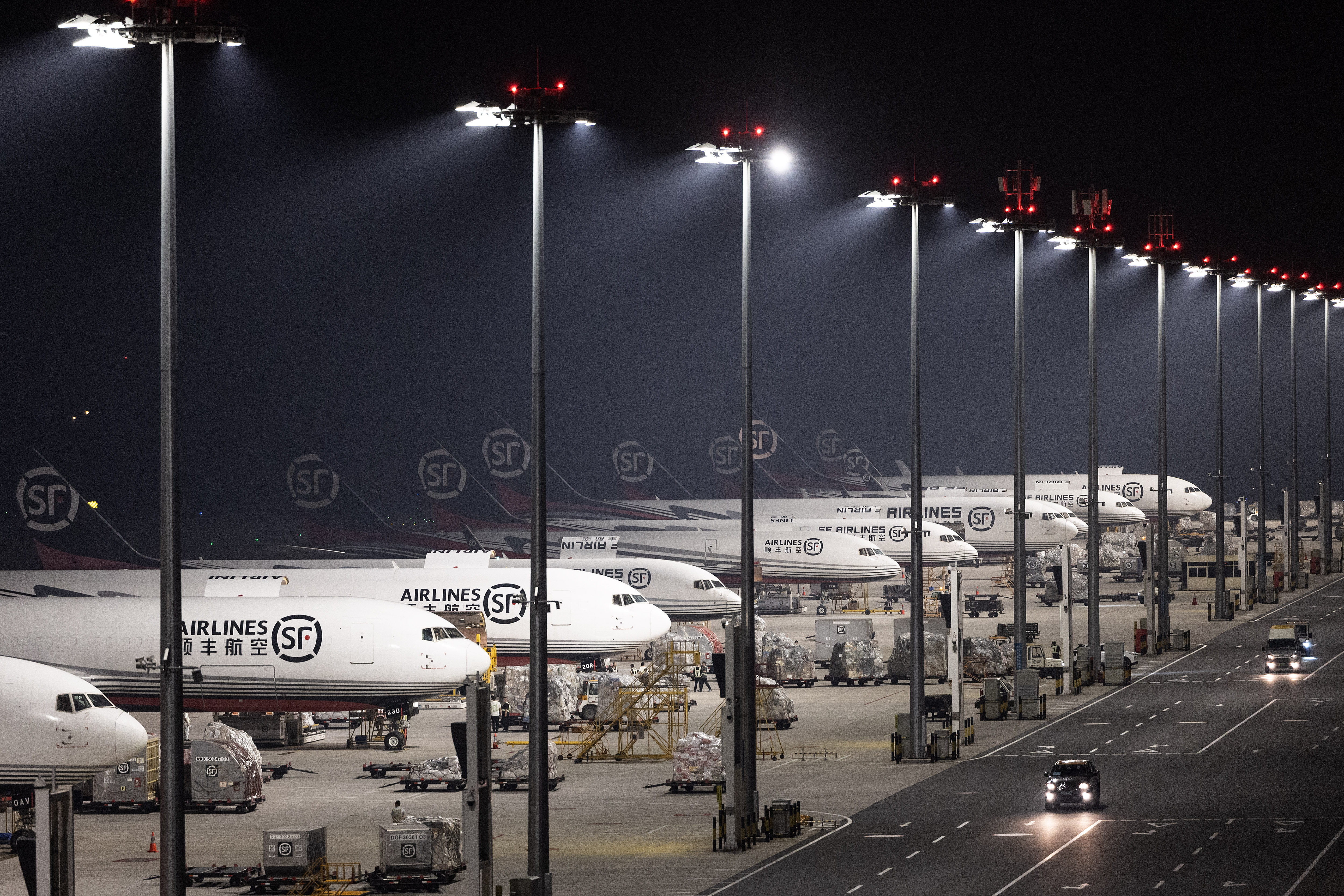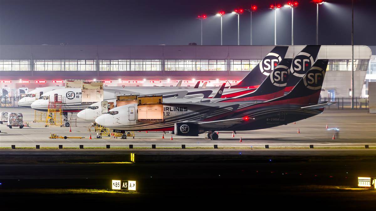 5月25日凌晨,在鄂州花湖机场顺丰转运中心,顺丰航空的全货机正在转运货物。 (湖北日报全媒记者 任勇 通讯员 王星予 摄)