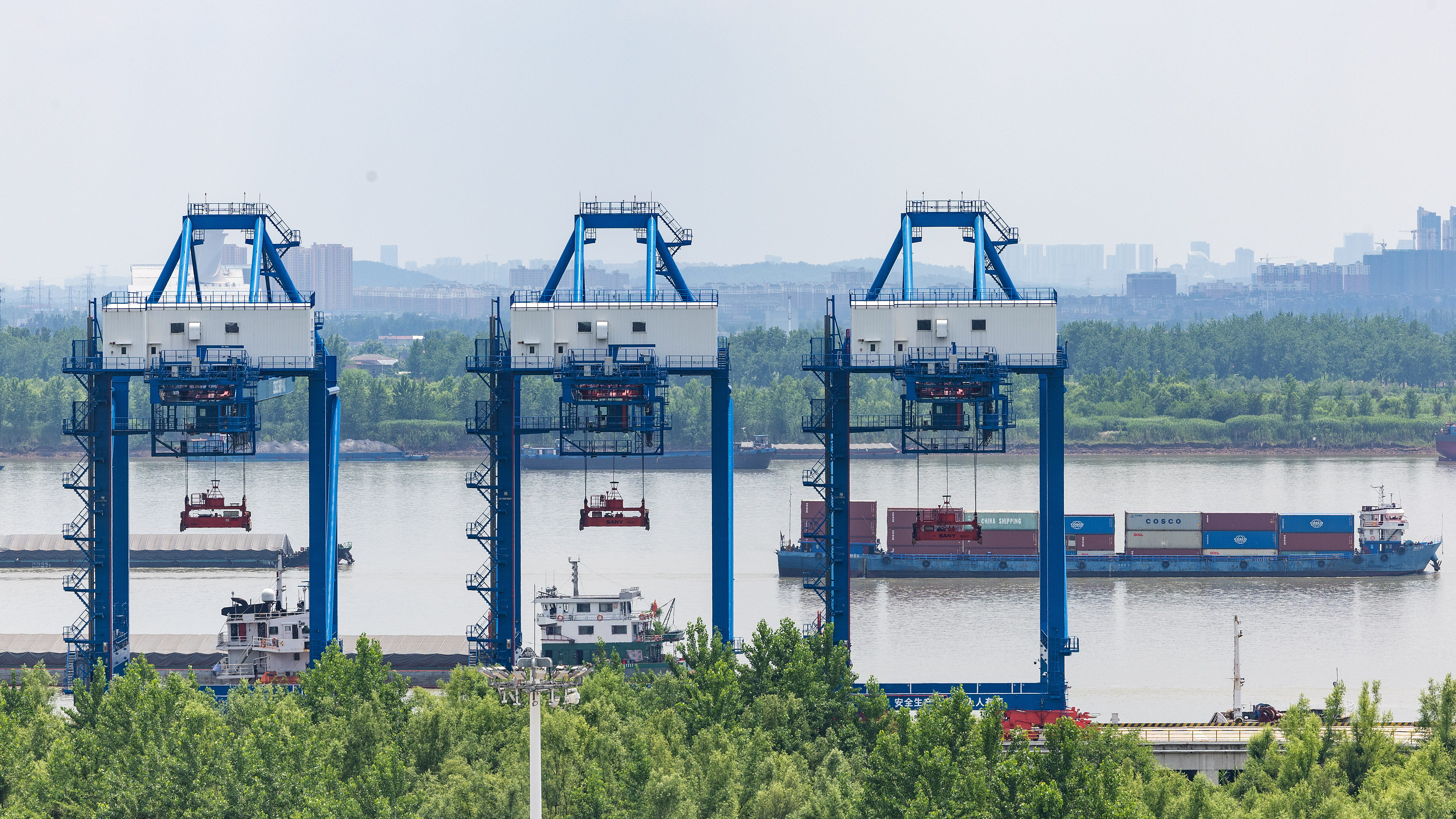 5月23日,武汉中远海运港口码头有限公司(简称“CSP武汉码头”)一片繁忙,无人驾驶集装箱卡车在堆场中来回穿梭,全自动远程作业的龙门吊精准抓起集装箱整齐堆放。 (湖北日报全媒记者 任勇 通讯员 赵玉 摄)