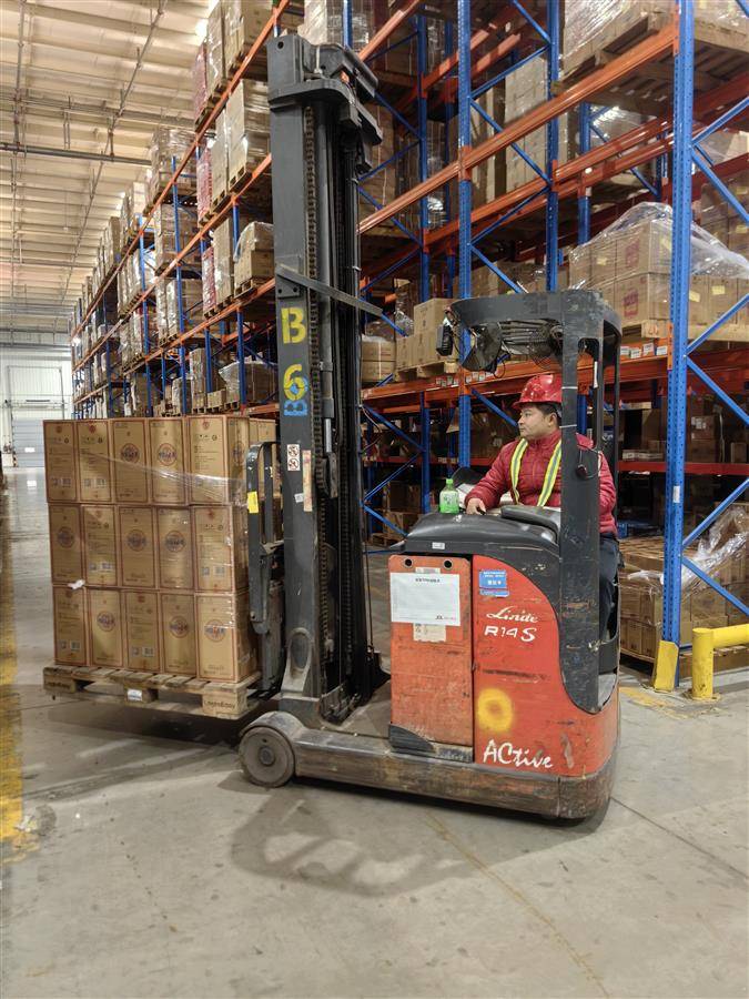 京东物流工作人员用叉车将劲酒从高架上取下,送往分拣线。