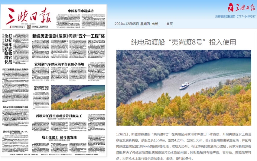 12月2日,新能源客渡船“夷尚渡8号”在夷陵区尚家河水库渡口下水首航,开启夷陵区水上客运绿色发展新篇章。