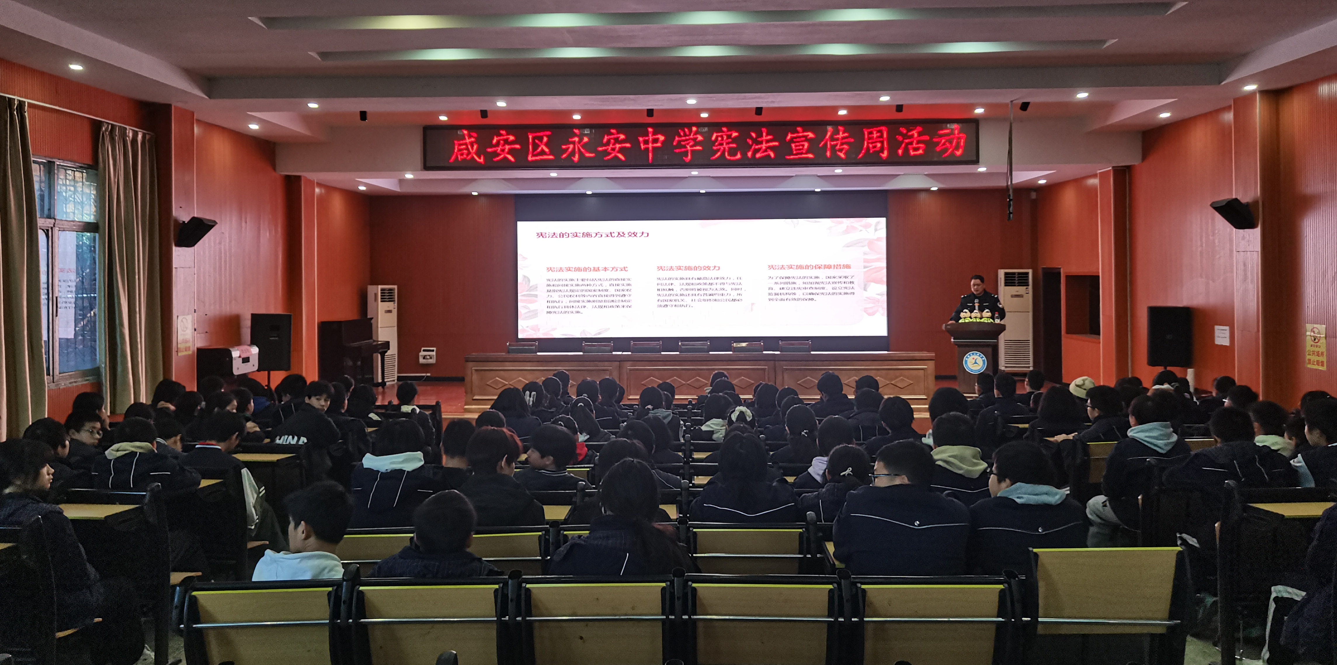 活动中,区公安分局交警大队民警饶继虎结合学生的年龄特点,用通俗易懂的语言,从宪法的基本概念、核心内容、宪法与青少年成长、宪法的实施与保障、国内外宪法典的比较与启示、中学生如何学习宪法等六个方面,向学生们讲解了宪法相关知识。