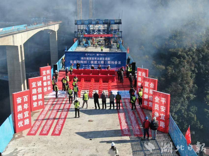 湖北日报客户端讯(通讯员李龙奥)日前,宜来高速宜昌段首座刚构桥——横渡大桥左幅合龙。横渡大桥是连接湾潭隧道与岩湾隧道的重要通道,全长542米。中跨合龙是横渡大桥施工的关键环节之一,为确保合龙的精度和质量,项目建设管理团队选择在一天中的最低温度时段,一次性浇筑完成中跨合龙段混凝土。