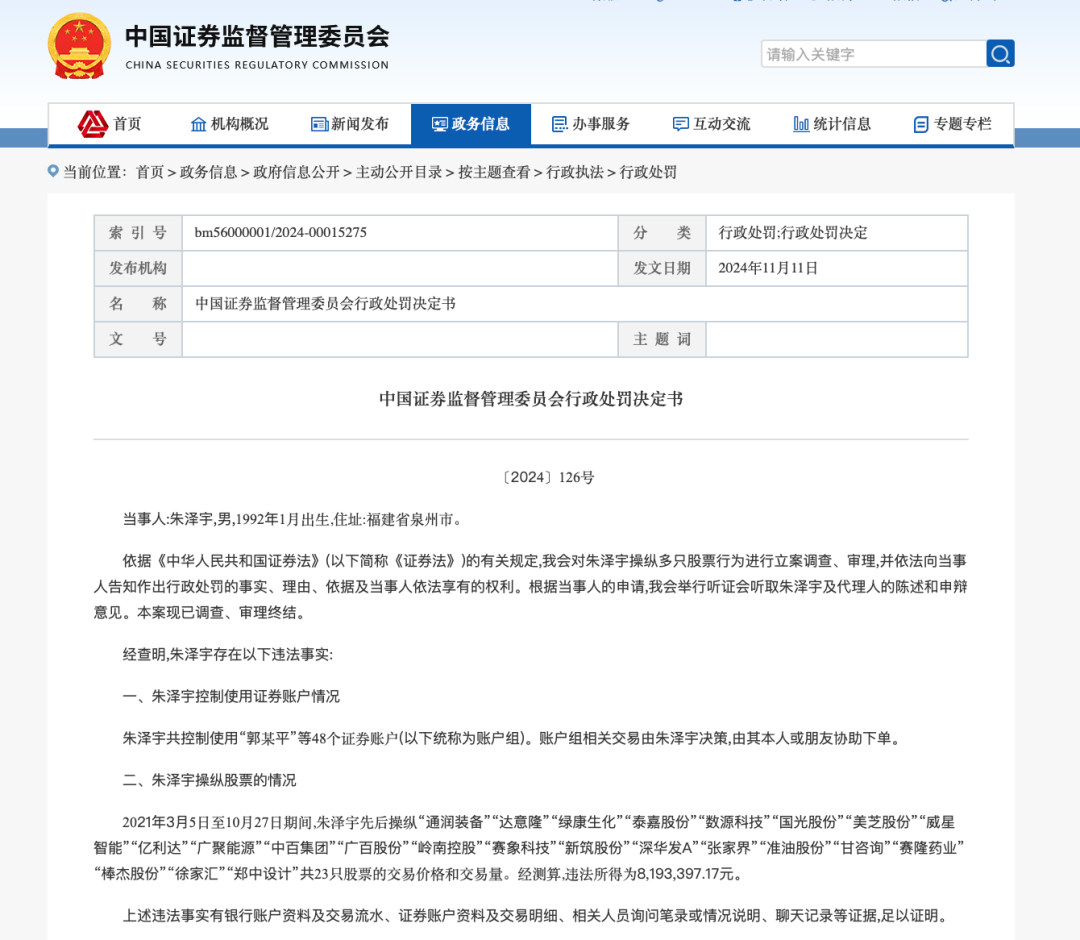 12月6日,据证监会官网信息显示,福建“90后”朱泽宇因通过48个账户操纵“通润装备”“达意隆”等23只股票,被证监会罚没近3500万元。行政处罚决定书显示,朱泽宇出生于1992年1月,住址位于福建省泉州市。经监管查明,朱泽宇共控制使用“郭某平”等48个证券账户(以下统称为账户组)。账户组相关交易由朱某宇决策,由其本人或朋友协助下单。2021年3月5日至10月27日期间,朱某宇先后操纵“通润装备”“达意隆”“绿康生化”“泰嘉股份”“数源科技”“国光股份”“美芝股份”“威星智能”“亿利达”“广聚能源”“中百集团”“广百股份”“岭南控股”“赛象科技”“新筑股份”“深华发A”“张家界”“准油股份”“甘咨询”“赛隆药业”“棒杰股份”“徐家汇”“郑中设计”共23只股票的交易价格和交易量。证监会表示,经测算,朱泽宇违法所得为819.34万元。证监会指出,朱泽宇的行为违反《证券法》第五十五条第一款第一项、第三项、第四项的规定,构成《证券法》第一百九十二条规定所述的操纵证券市场行为。朱泽宇曾提出申辩意见,请求减轻行政处罚或者不予处罚。经复核,证监会认为,朱泽宇的陈述申辩理由不能成立。根据当事人违法行为的事实、性质、情节与社会危害程度,依据《证券法》第一百九十二条的规定,证监会决定:一、对朱泽宇操纵股票获利超过100万元的,没收其违法所得558.71万元,并处以558.71万元的罚款。二、对朱泽宇操纵股票获利不足100万元或亏损的,没收其违法所得260.63万元,并分别处以100万元的罚款,共计2100万元。综上,监管合计没收朱泽宇违法所得819.34万元,并处以2658.71万元的罚款。罚没金额合计3478.05万元。