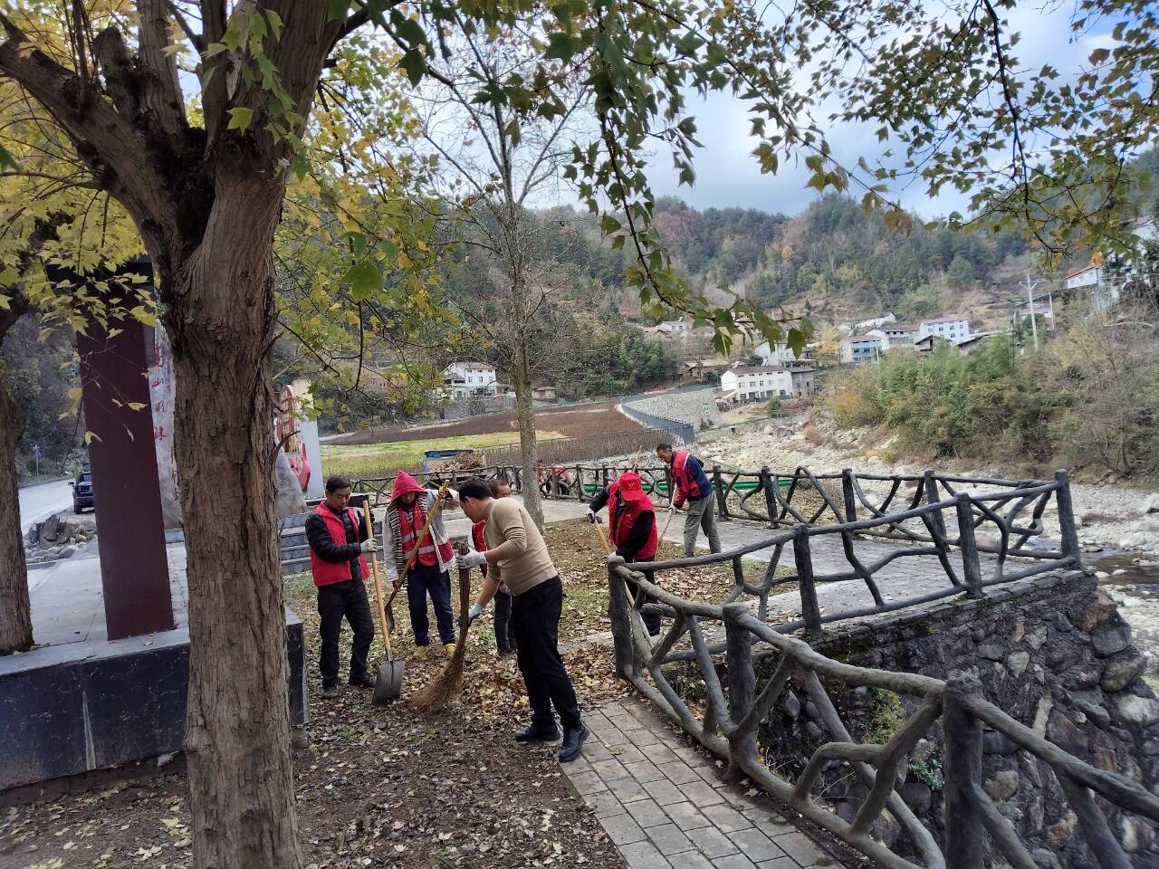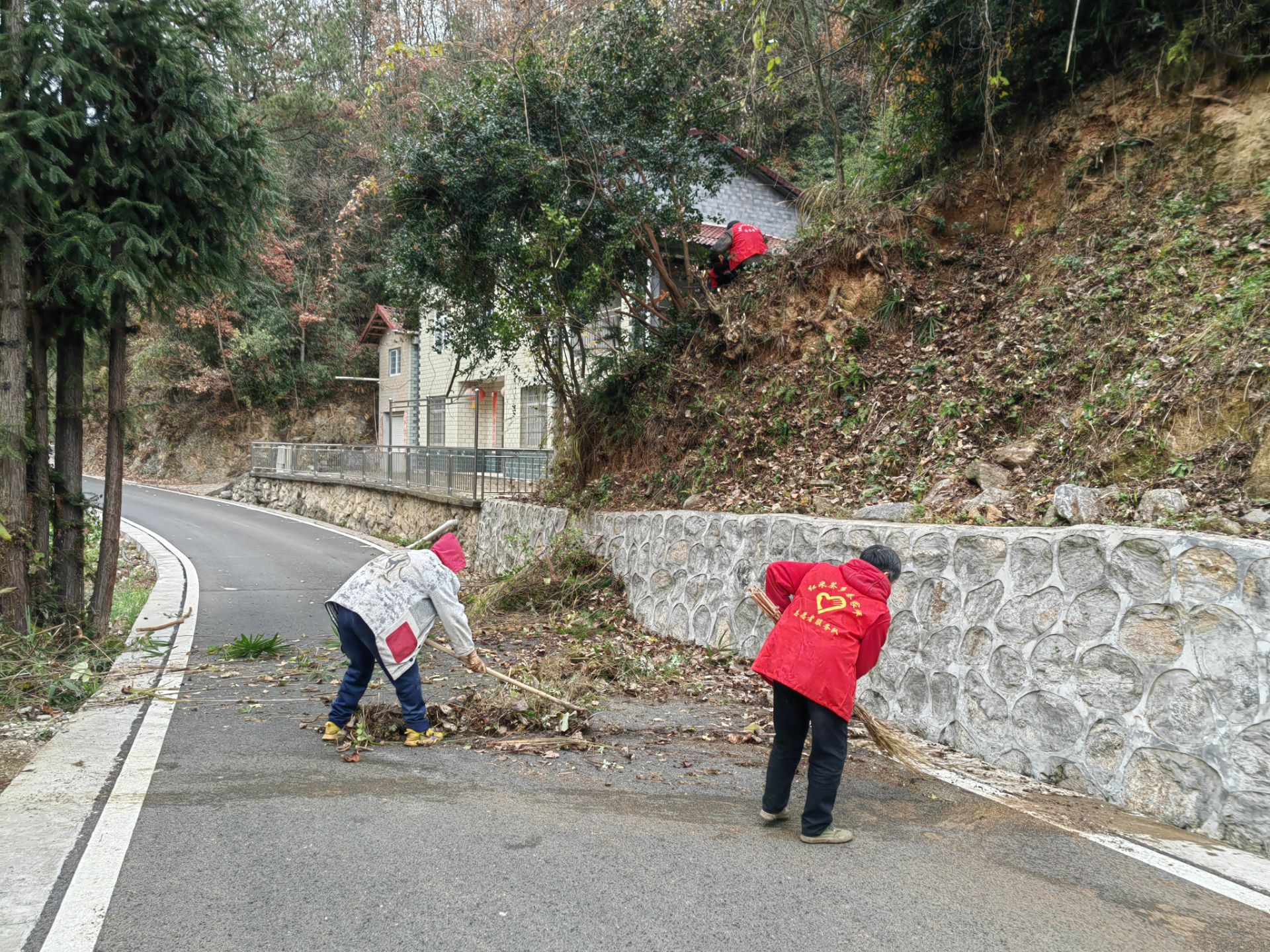 活动中,党员干部下沉服务队带领志愿者们收拾掉落的树叶、枯枝,清理草癣、积存垃圾和乱堆放的杂物。社区工作人员清理大桥停车场处满地落石、堆积的泥土。