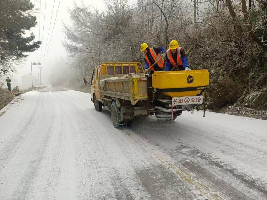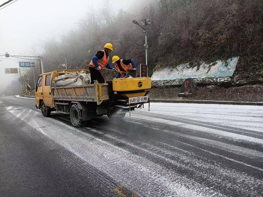 湖北日报客户端讯(通讯员习倩、陈鹄)12月10日,长阳土家族自治县辖区内国省干线公路部分路段迎来今冬首场降雪。碑坳、晓峰垭等高海拔路段出现不同程度积雪、结冰。长阳公路部门以雪为令、快速反应,第一时间启动除雪保畅应急预案,并组织机械、人员上路撒布融雪剂和防滑料,全力保障过往行人、车辆通行安全。