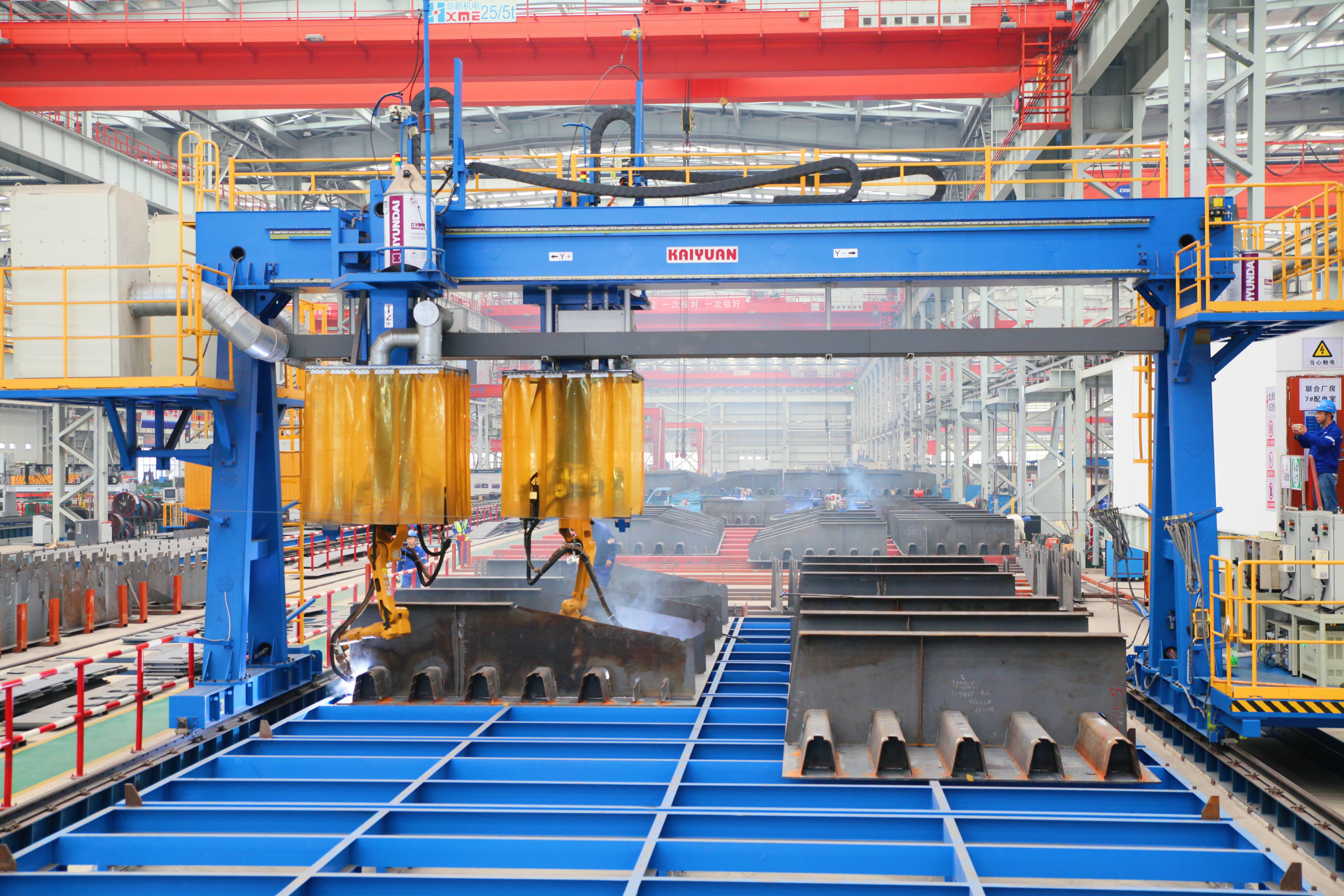 另一方面积极推进项目智能制造和工法创新,单元件制造实现100%无马组装,智能化焊接设备使用率100%,生产效率提高了30%以上,探伤一次合格率达99%以上;基于新型无马装配、高效总拼焊接、智能涂装作业等工序开展技术微创新共计40余项,特别是在防撞护栏生产线工序优化方面做出卓有成效的改进,开发1.2mm实芯细丝埋弧自动焊工艺,研发棱角焊缝专用打磨机,配置编程自动焊接机器人近十台套,较原有人工装焊作业效率提升近4倍;积极推行便携式焊接机器人、全方位焊接机器人及焊接群控系统等智能焊接技术的应用,缩短了生产周期,降低了人员劳动强度,提升了焊接质量,钢箱梁总拼智能焊接在深中通道项目基础上提高了10%。
