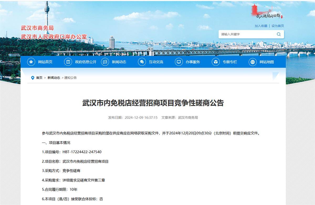 湖北日报讯 (记者黄磊)从武汉市商务局获悉,武汉不久后将落地首家市内免税店,目前该项目已进入经营招商阶段。12月9日,武汉市商务局在官网上正式发布关于武汉市内免税店经营招商项目竞争性磋商的公告。