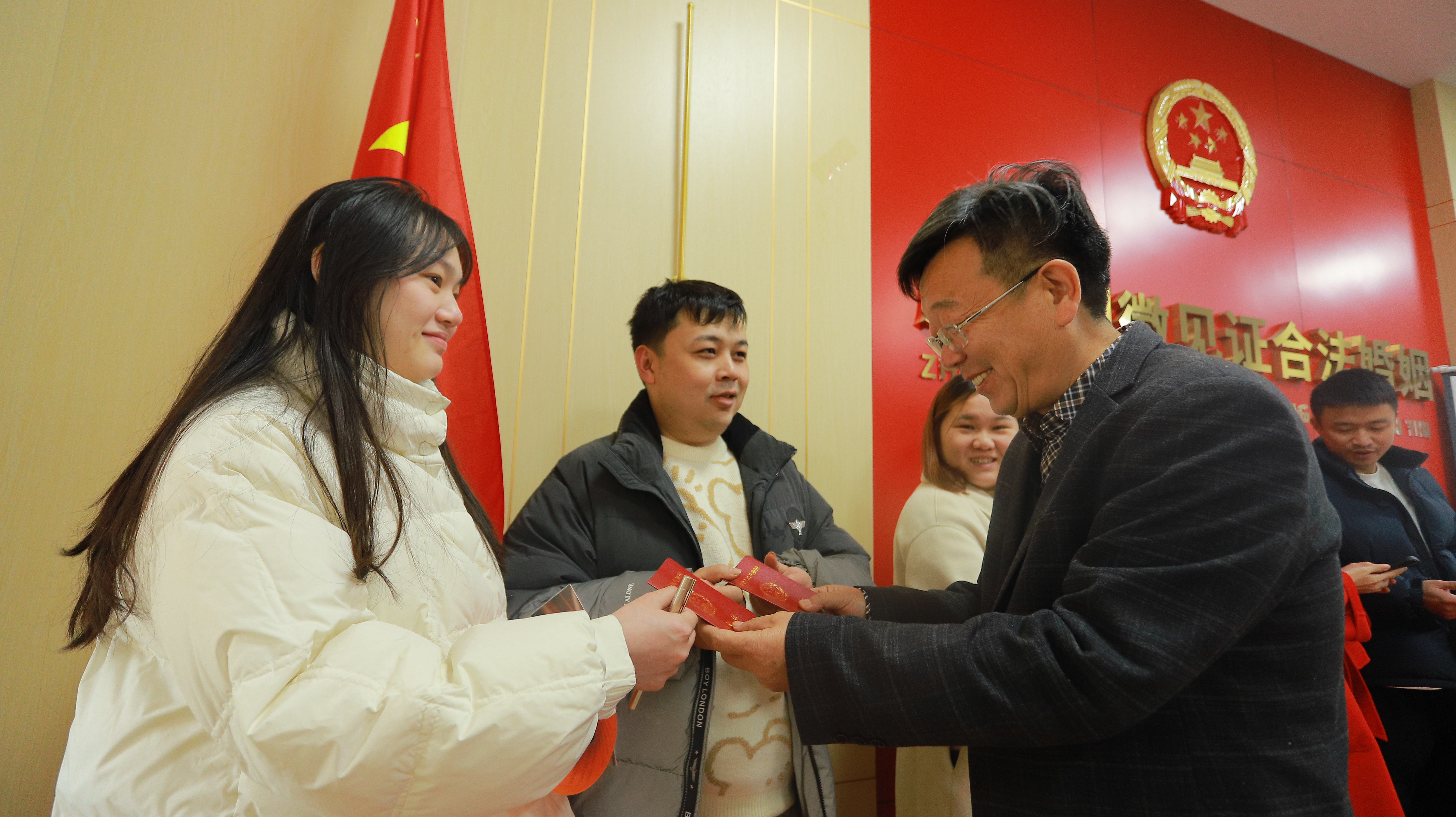 宣誓仪式上,4对新人在庄严的国徽见证下,许下相伴一生的誓言,声音坚定而深情。领到结婚证后,每一对新人脸上都洋溢着幸福的笑容,手中的结婚证不仅是一份法律的认可,更是他们爱情与责任的见证。