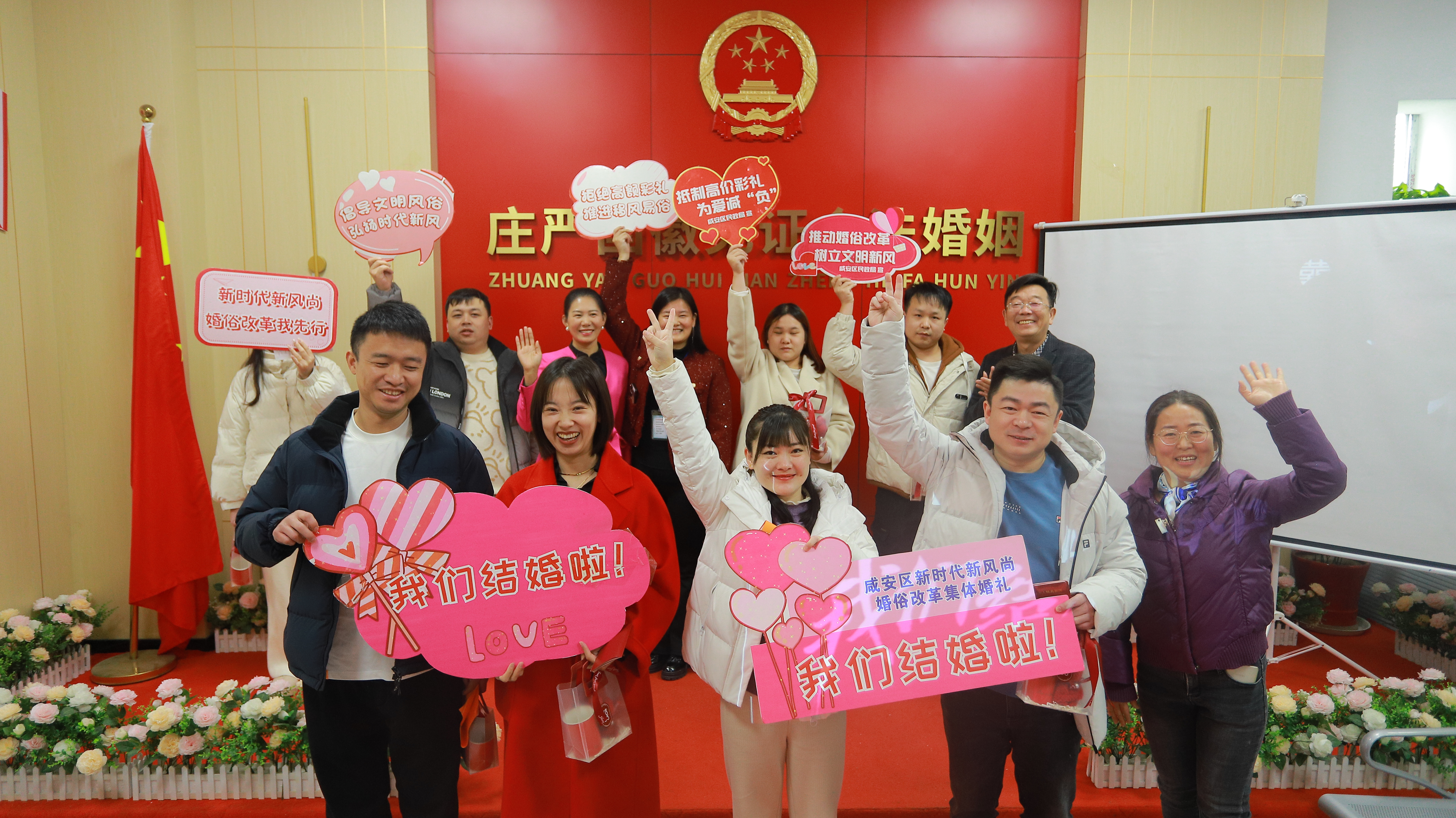 湖北日报客户端讯(通讯员阮辉、戴维丹、刘敏学)12月12日,咸安区民政局婚姻登记处洋溢着幸福与喜悦的氛围,一场以“新时代 新风尚 婚俗改革我先行”为主题的结婚登记集体颁证活动在这里举行,旨在弘扬时代新风,倡导文明婚俗,为新人们留下难忘而有意义的纪念。