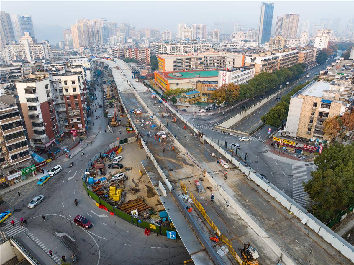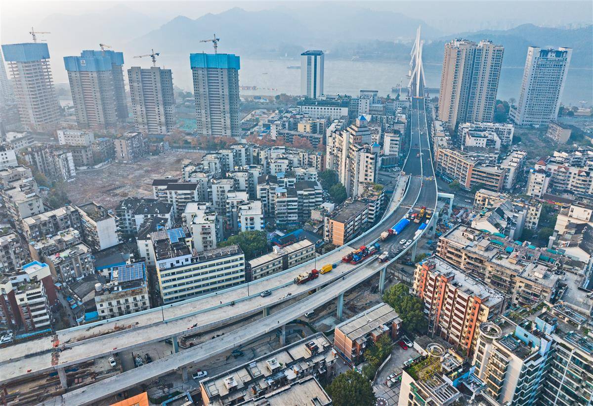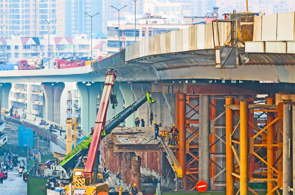 12月13日,宜昌夷陵长江大桥施工现场,施工人员正在拆除大桥施工搭建的辅助设施,目前,八联桥梁主体部分已全部完成,即将进行桥面沥青摊铺,附属工程将于本月中旬可完工。据了解,该工程道路主线总长5470.901米,桥梁总长3872.4米,是宜昌市“三环十二射”跨江环线的重要组成部分,夷陵长江大桥延伸段的通车时间预计为2025年1月1日。(湖北日报全媒记者 刘曙松 摄)