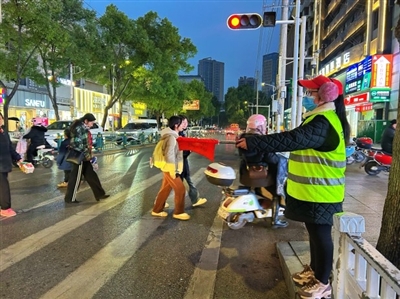 12月9日17时,随着晚高峰的到来,淦河大道温泉第一街逐渐车水马龙,人流如织。此时,交通劝导员陈程准时出现在岗位上,她手持小红旗,认真指挥着行人与车辆。