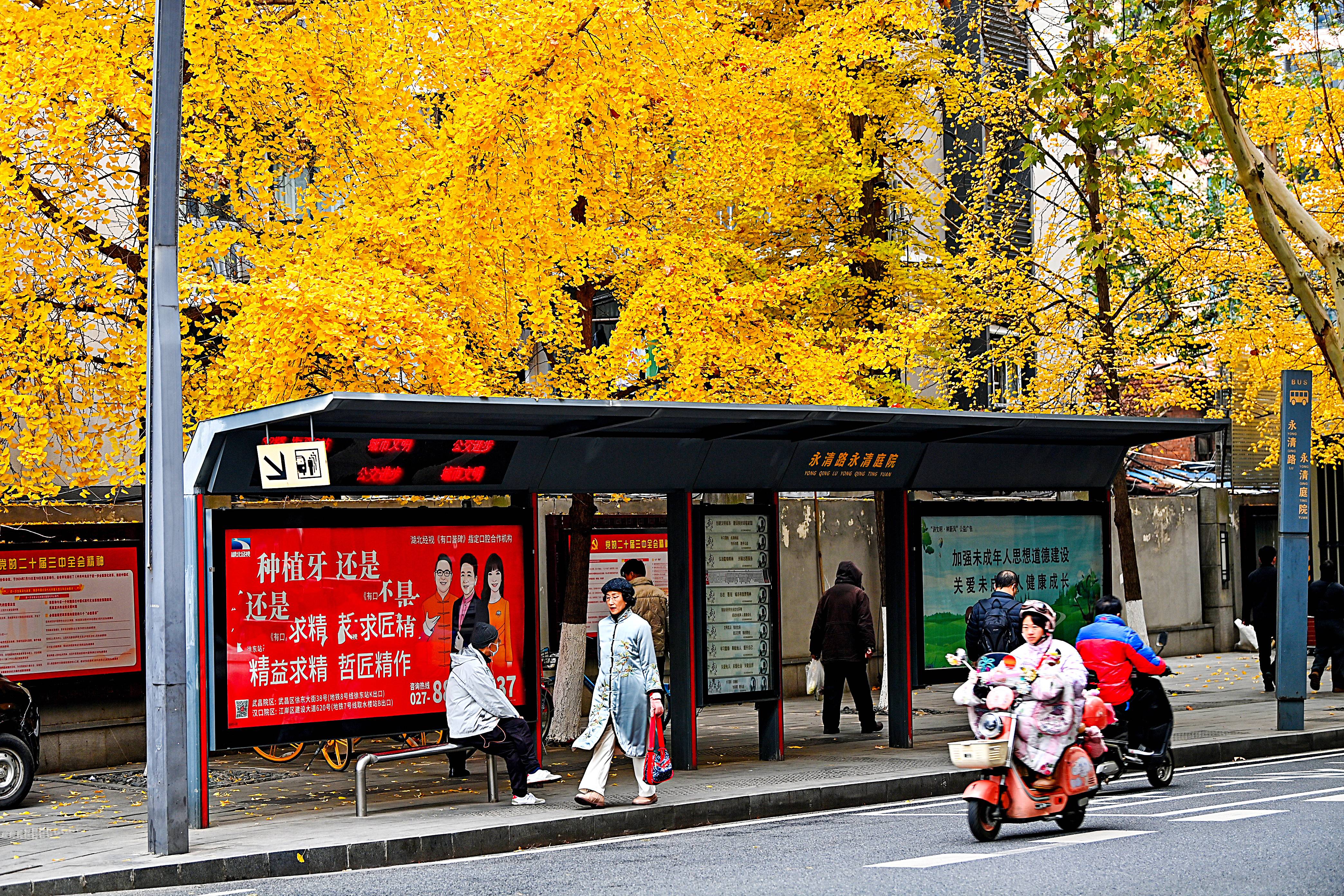 12月12日,记者发现,汉口建设大道、解放公园、江大路天桥、永清路公交站被金黄的银杏树装扮着,这如诗如画的美景让人格外的欣喜和珍惜,吸引来往的人们赴一场银杏叶的黄金盛宴。