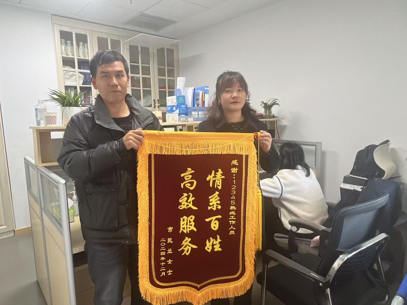 12月16日,周一刚上班,市民兰女士专程赶到咸安区12345热线平台,将一面印有“情系百姓 高效服务”的锦旗送到了12345工作人员手中,以表达对他们辛勤付出和优质服务的高度认可和赞扬。