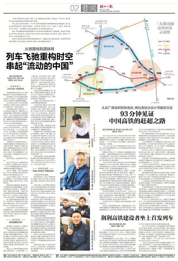 “报网端微屏”齐发力,全媒体精彩呈现,让新闻持续热辣滚烫。12月9日,《湖北日报》2版刊发《从铁路线到高铁网 列车飞驰重构时空串起“流动的中国”》《从武广高铁到荆荆高铁,两位高铁总设计师隔空对话 93分钟见证中国高铁的赶超之路》两篇深度报道;当晚,《新闻访谈丨开聊吧!在这趟特殊的高铁上》在湖北日报客户端刊发。