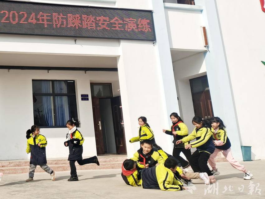 湖北日报客户端讯(通讯员 许光泽 张继敏 刘万富)一队学生“快速”跑来,一名学生突然停下脚步弯腰系鞋带,后面的学生猝不及防,纷纷被绊倒,造成“人仰马翻”……12月17日上午,丹江口市丁家营镇小学开展了一场别开生面的防拥挤踩踏事故安全演练。