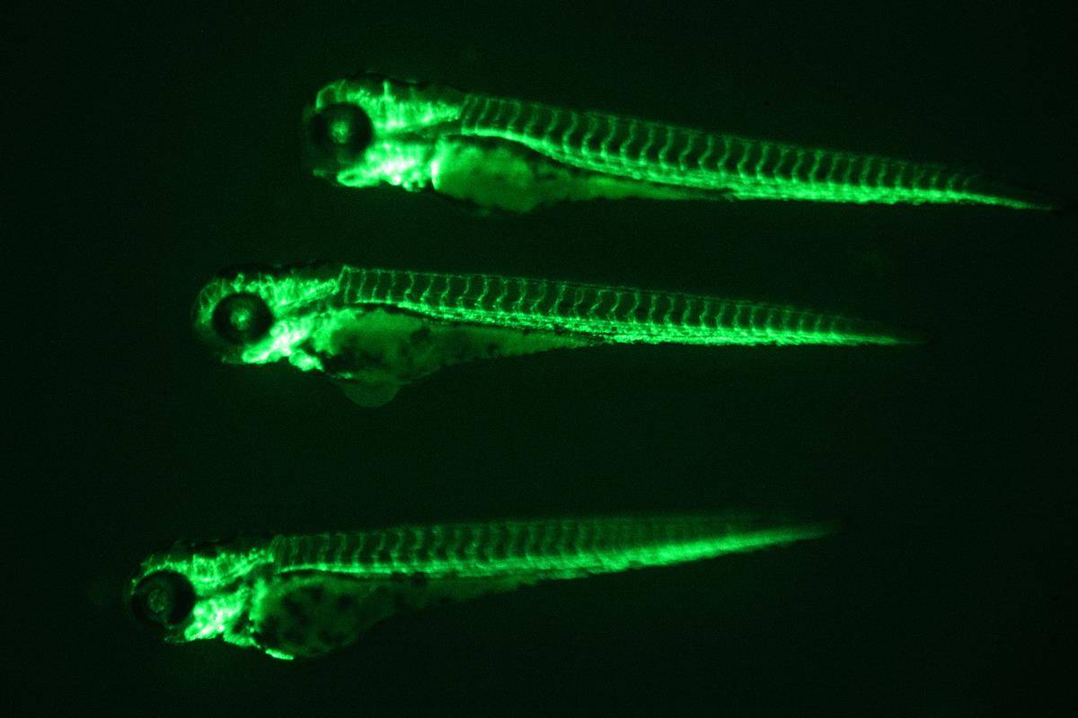 2024年9月23日,在水生所国家斑马鱼资源中心实验室,斑马鱼的血管分布情况在荧光显微镜下清晰可见。(显微摄影)