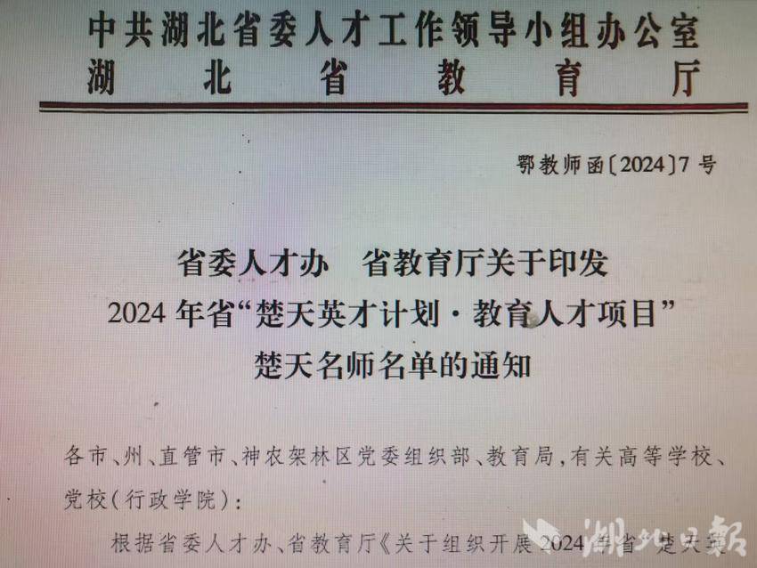 据悉,根据省委人才办、省教育厅《关于组织开展2024年省“楚天英才计划·教育人才项目”楚天名师遴选培育工作的通知》要求,按照个人申报、单位推荐、专家评审和社会公示等程序,确定武汉大学苏德超等29名高等学校教师、武汉市第四中学高海英等40名中等及以下学校教师和中共湖北省委党校(湖北省行政学院)王辉等1名党校(行政学院)教师为2024年省“楚天英才计划·教育人才项目”楚天名师。