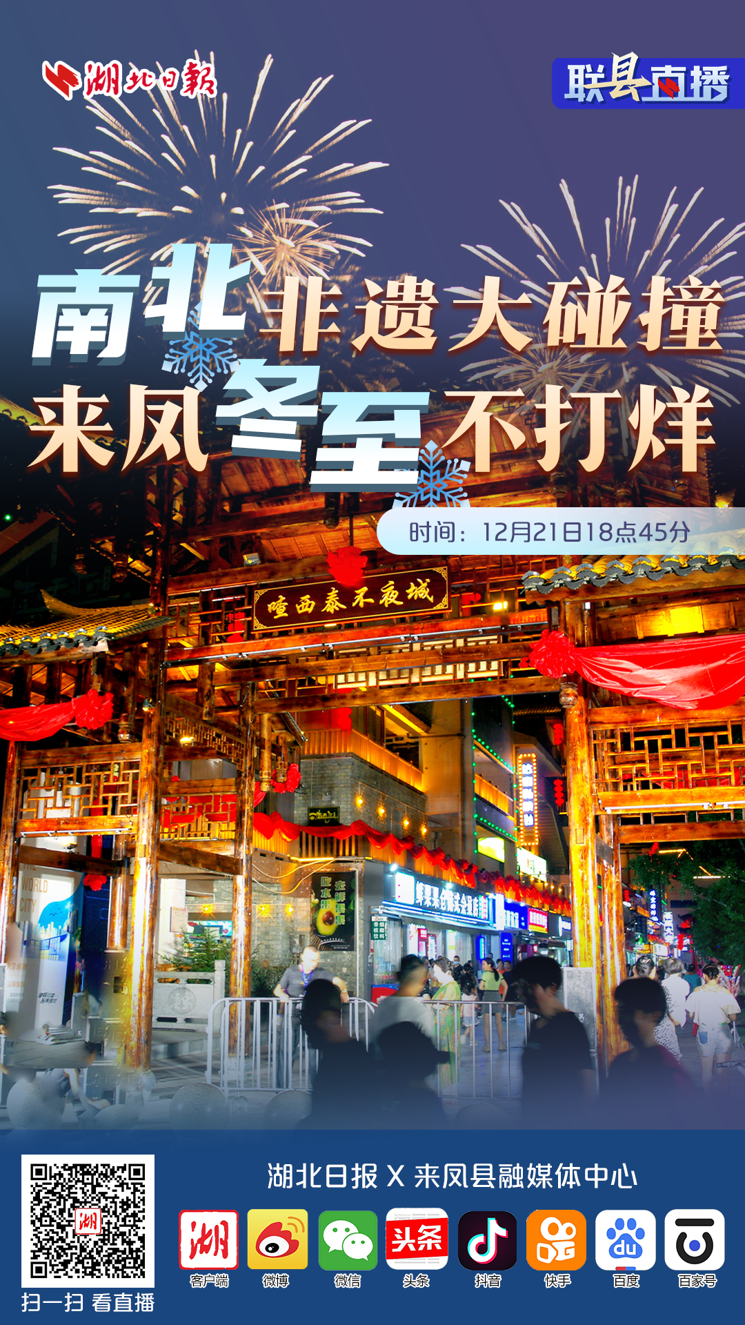 12月21日18点45分,湖北日报联动来凤县融媒体中心,在冬至这天走进喳西泰不夜城,带网友包饺子、制油茶汤、听南戏、赏东北二人转,看南北非遗在这里碰撞出的火花。