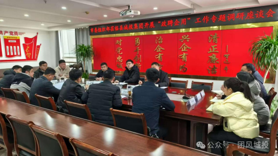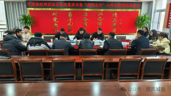 12月19日,黄冈市委组织部领导一行莅临团风县城市建设投资集团有限公司开展“政聘企用”工作专题调研活动。县委组织部副部长方学兵、县公共就业和人才服务中心主任孙志超、县委组织部干部王博等陪同调研;县城投集团党委书记、董事长漆鹏,集团党委副书记、副董事长、总经理何佳元,集团党委委员、监事会主席易志武及五名“政聘企用”人员参加活动。