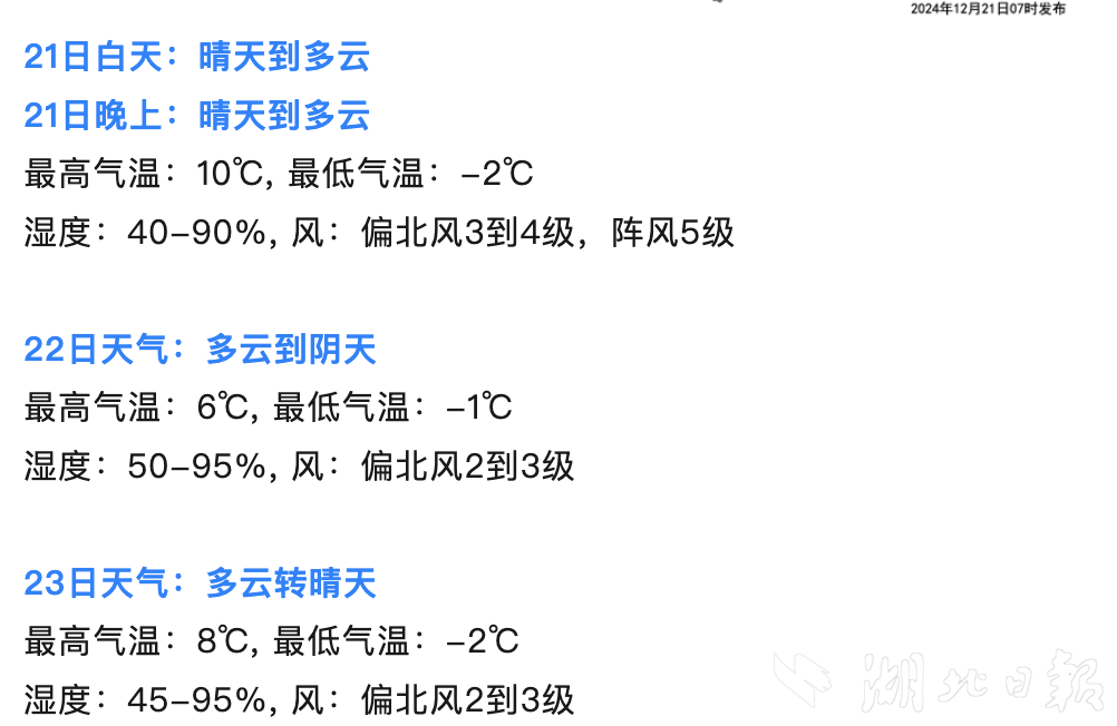 湖北日报讯(记者汤炜玮、通讯员武气象)12月21日从武汉市气象局获悉,预计未来一周武汉市都是晴或多云天气,早晚气温低,市民朋友注意防寒保暖。
