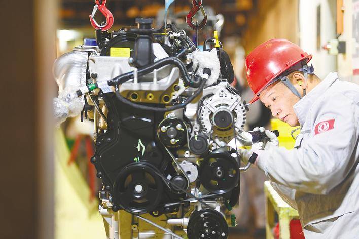 12月6日,东风轻型发动机有限公司(十堰张湾)M9T混流装配线上,工人加紧赶订单。(湖北日报全媒记者 田悦 通讯员 冯杰 摄)