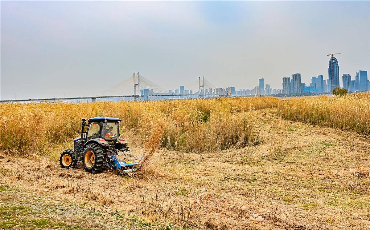 12月23日,两台农用机在武汉汉口江滩十里芦苇地中穿梭忙碌,一排排芦苇被推倒粉碎。这里每年秋季“芦花”似雪,成为“江城”一景。