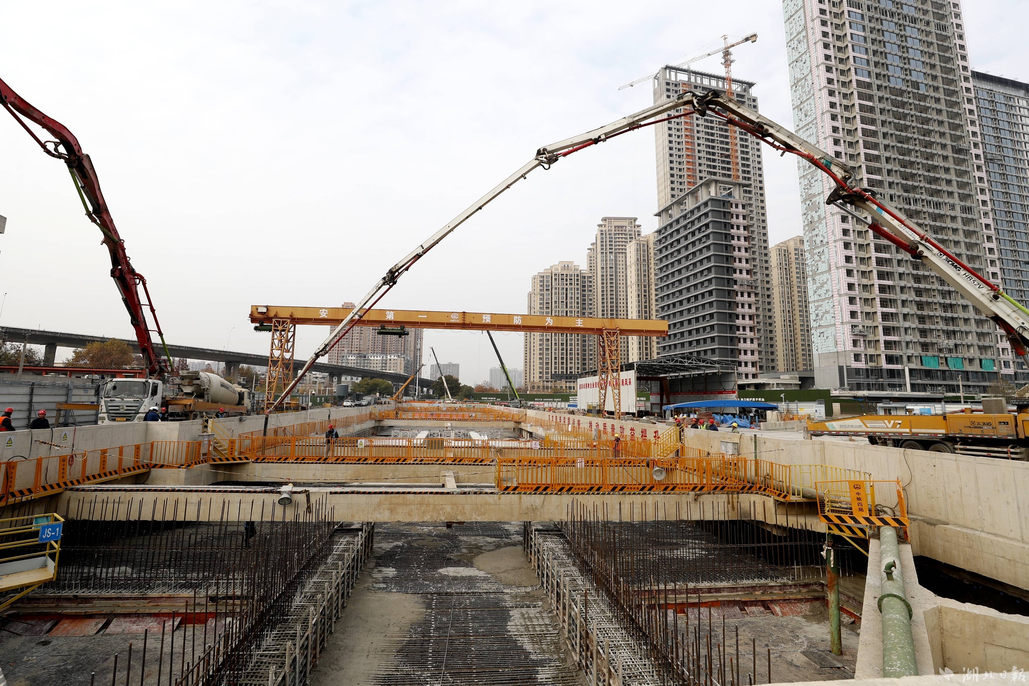针对寒冬季节,双墩站建设迎来主体结构封顶的关键冲刺阶段,承建单位中铁四局项目经理张舵介绍,武汉地铁集团、中铁开发投资集团有限公司针对冬季混凝土易冻结、施工难度加大的特点,多次组织开展专家论证和技术交底会议,制定详细的冬季专项施工方案和应急预案,敲定浇筑顺序、混凝土配合比、泵送方式。同时,开展协作队伍专项技术培训,对作业人员进行全面技术交底,通过模拟演练、实操培训等方式,确保冬季浇筑流程、技巧、要点认识全覆盖,保障浇筑质量。