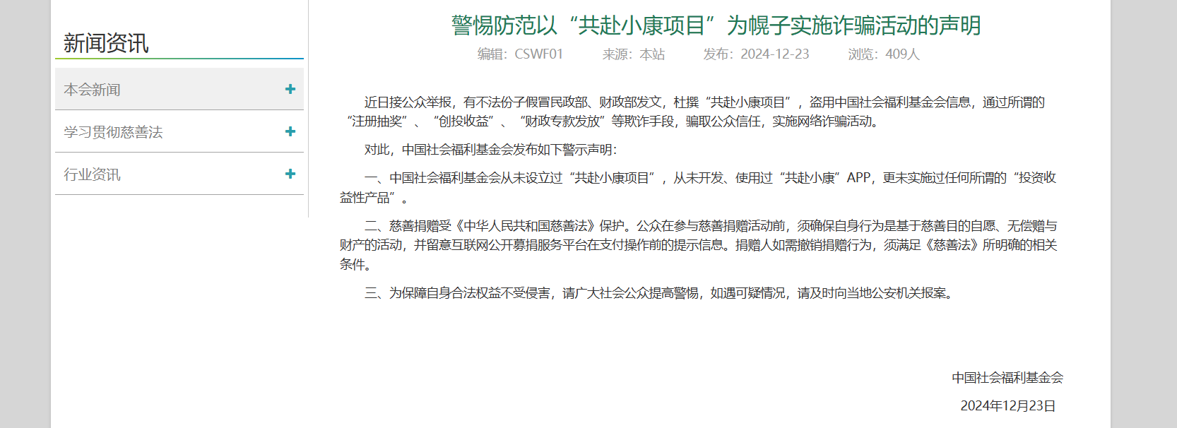 12月24日,中国社会福利基金会在其网站发布警示声明,声明如下: