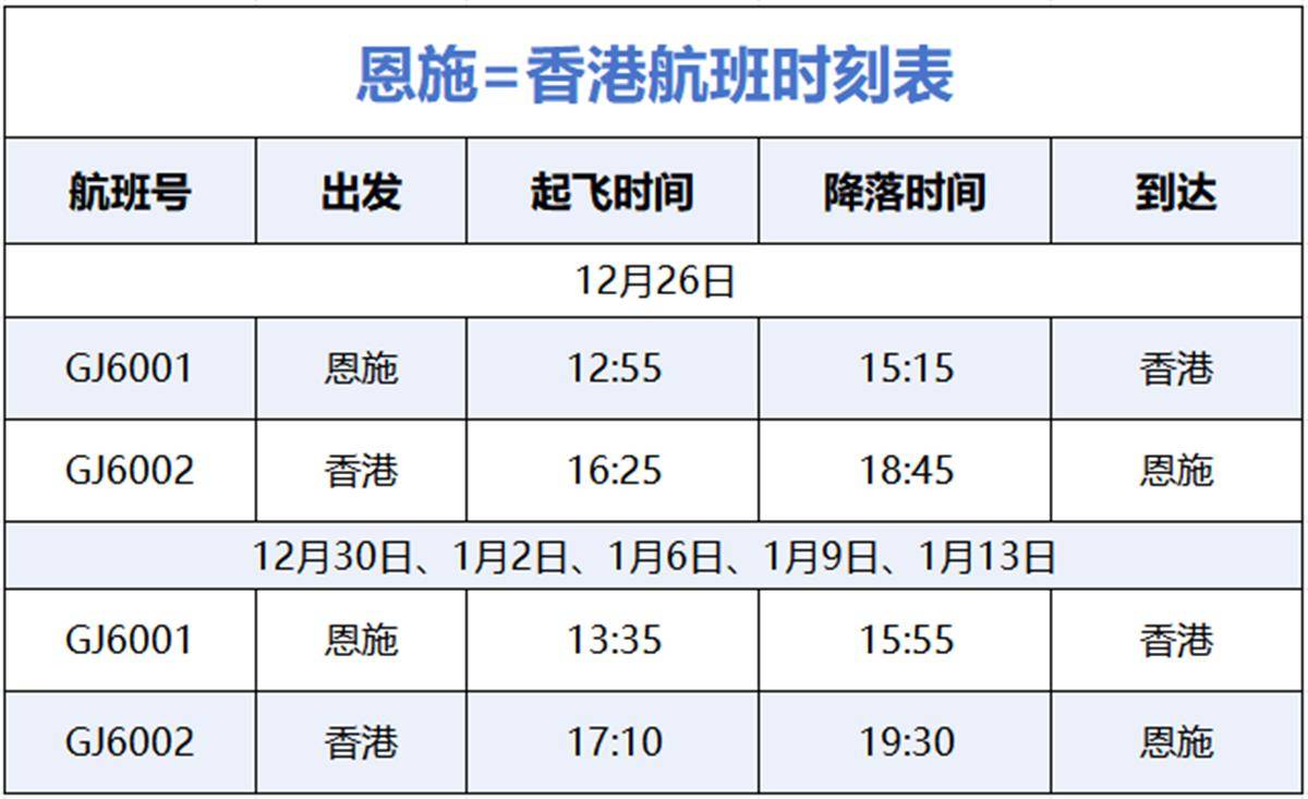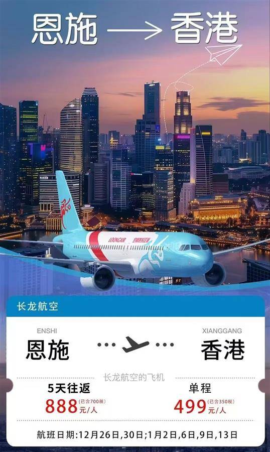 据该航线由长龙航空A320机型执飞,计划12月26日、30日,2025年1月2日、6日、9日、13日各执行一班。具体航班时刻为:12月26日,恩施12:55—15:15香港(GJ6001);香港16:25—18:45恩施(GJ6002)。12月30日,2025年1月2日、6日、9日、13日恩施13:35—15:55香港(GJ6001);香港17:10—19:30恩施(GJ6002)。目前,该航班机票已在各大OTA平台开售,往返票价888元/人。