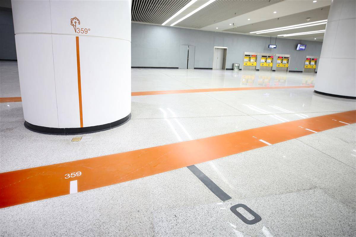 “为了方便乘客通行,车站在二级信息牌上也标注了对应的颜色,乘客除了通过立柱指引标志查看,还可以通过地面颜色和刻度,精准确定自己所处的位置。”11号线光谷广场站值班站长聂珑介绍说,车站共设2处进站安检点、2个客服中心,分别为R口(棕色)0度处、J口(蓝色)120度处。