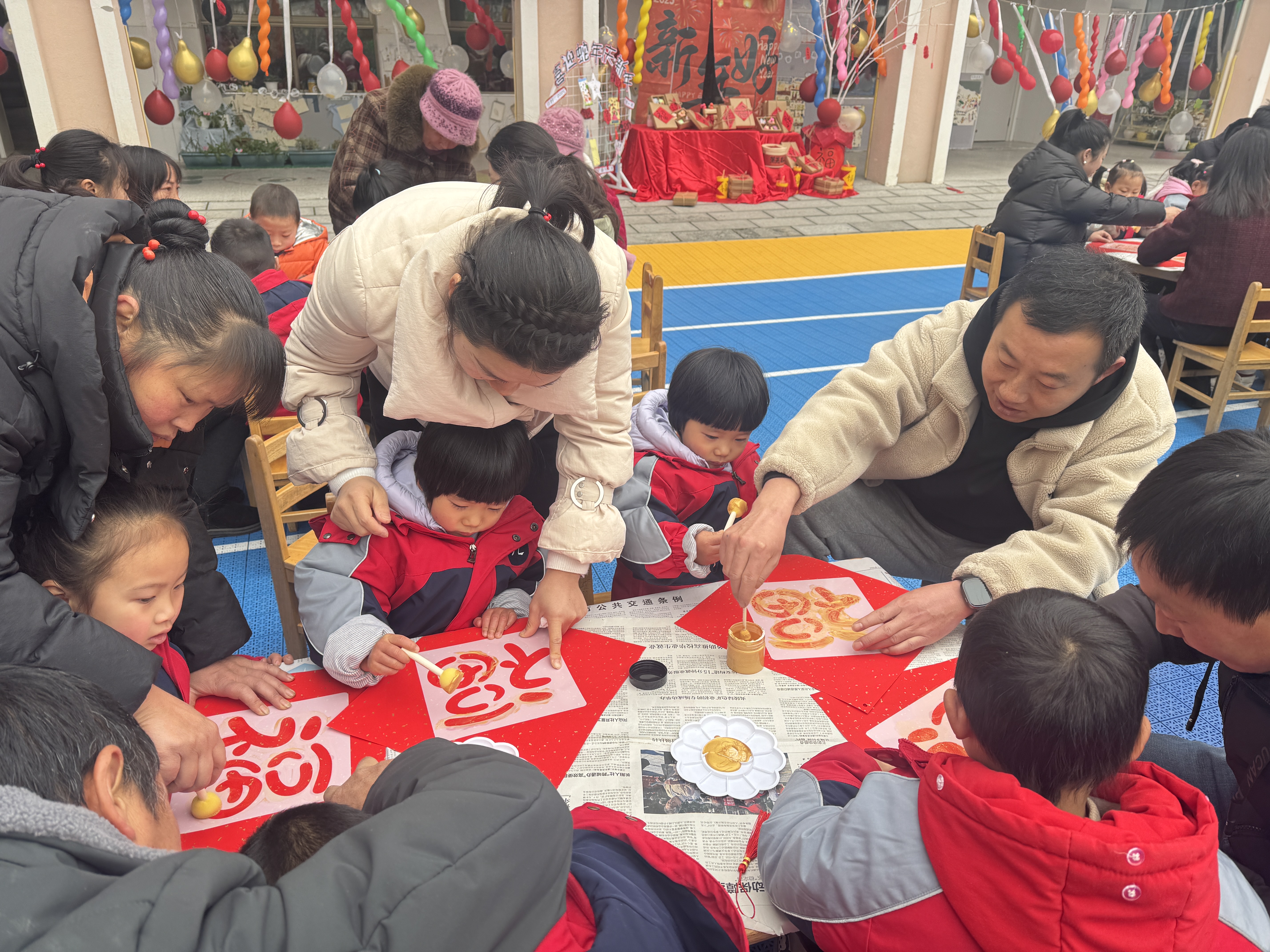 喜庆动感的亲子热身操,欢乐有趣的亲子小游戏,让在场的家长和幼儿们玩得不亦乐乎。活动最后,大家围坐一起,用一双双巧手完成了一幅幅新年拓印画,寄托对新年的美好祝愿。