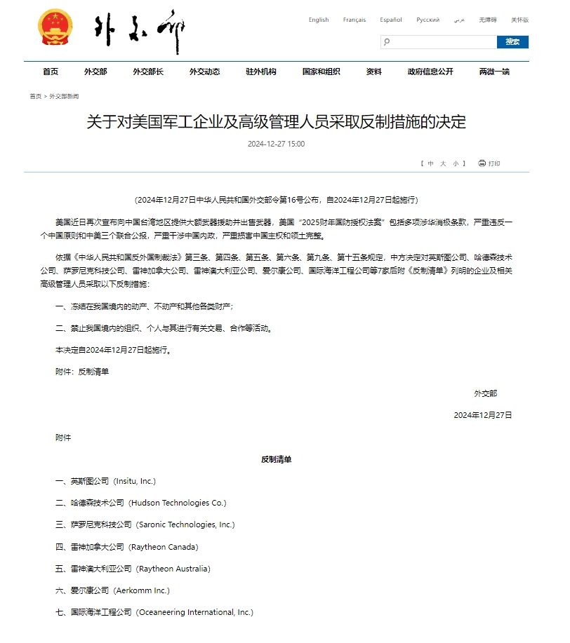 关于对美国军工企业及高级管理人员采取反制措施的决定